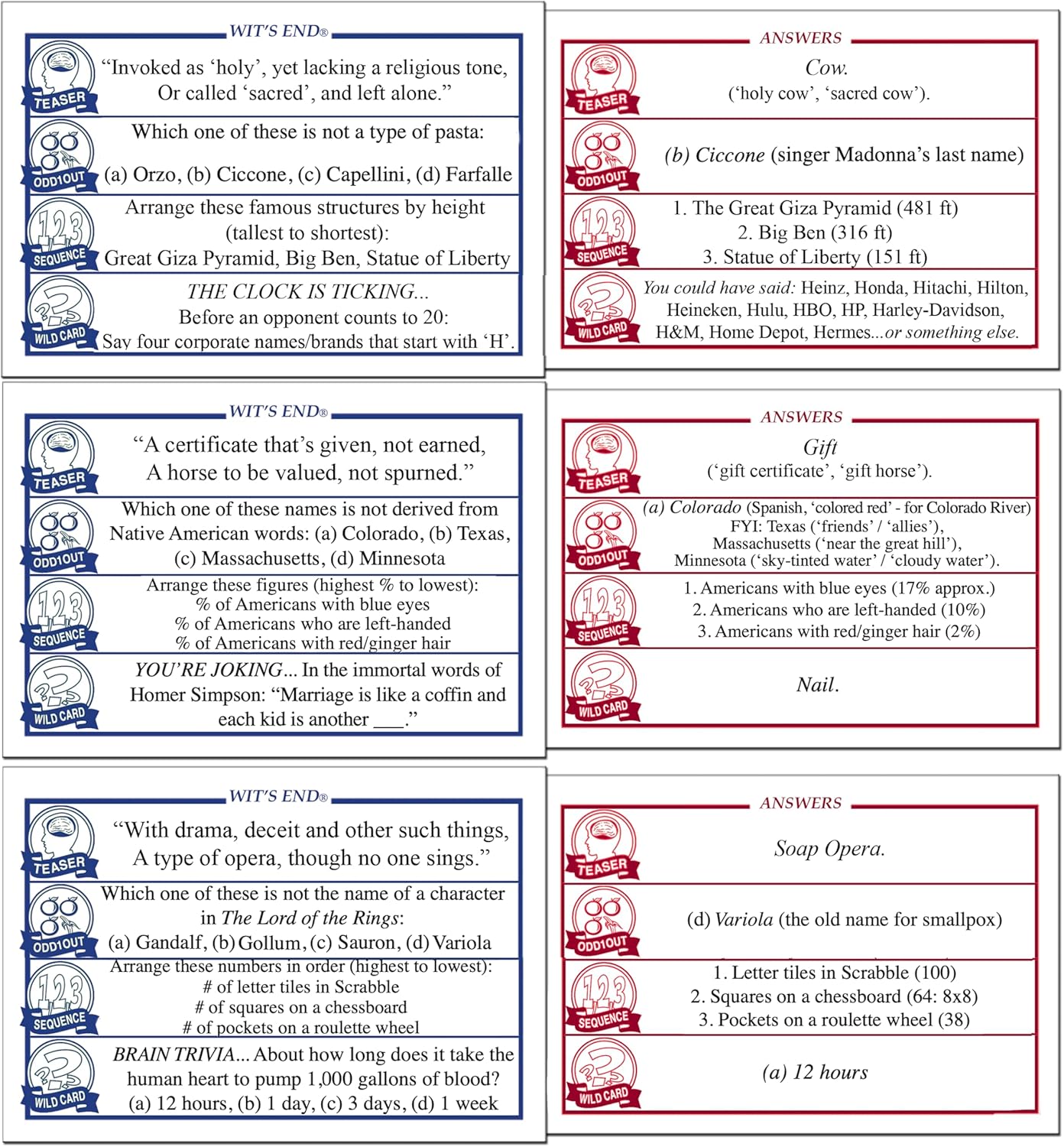 - Think You're Smart? Prove It! — Wit's End is a challenging trivia and brain-teasing board game where players battle wits in four mind-bending categories of smart trivia. Four uniquely designed categories engage your powers of deduction as well as your knowledge: