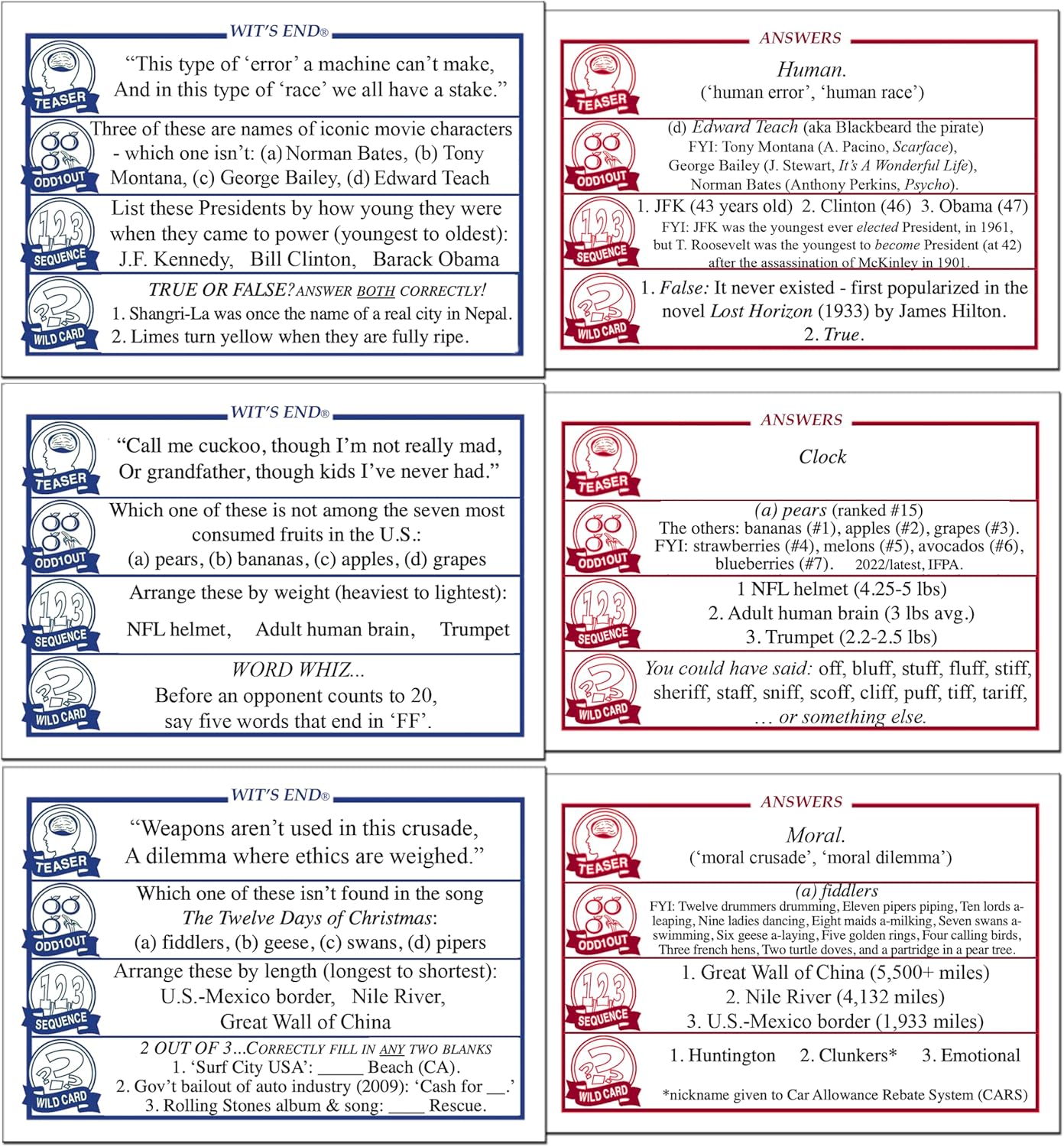 - [A Quick Note: Wit's End undergoes regular updates, incorporating a variety of new questions into the standard card set. This most recent print is copyright (c) 2025, as indicated on the lower left-hand corner of the back of the box.]