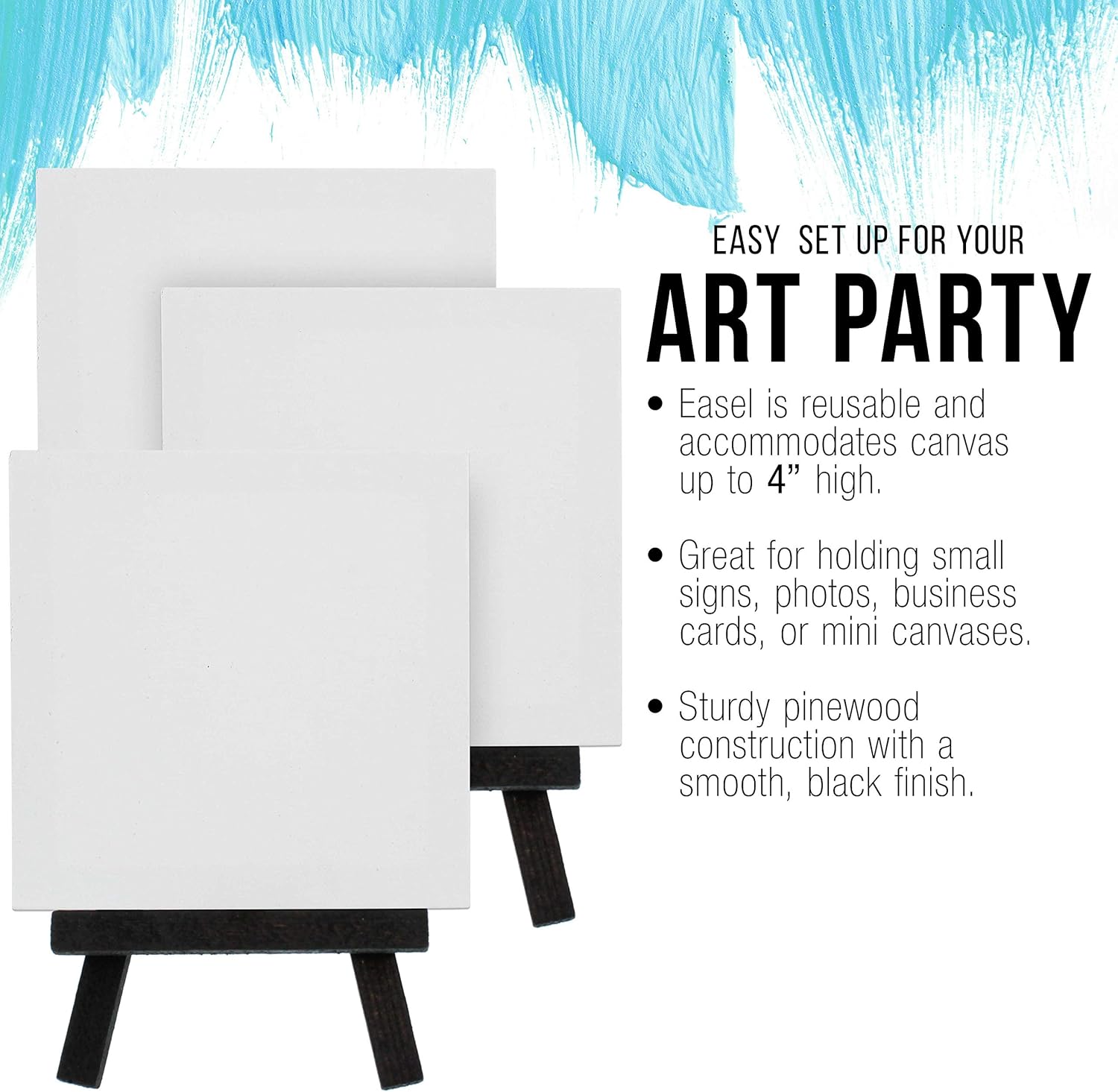 - (12 Pack) 5" Mini Easel with 3" x 3" Stretched Canvases Kit: Each kit contains a 5" black wooden tabletop easel. The kit also includes 3" x 3" stretched artist canvas with a 3/8" profile that's triple primed with acid-free acrylic gesso.