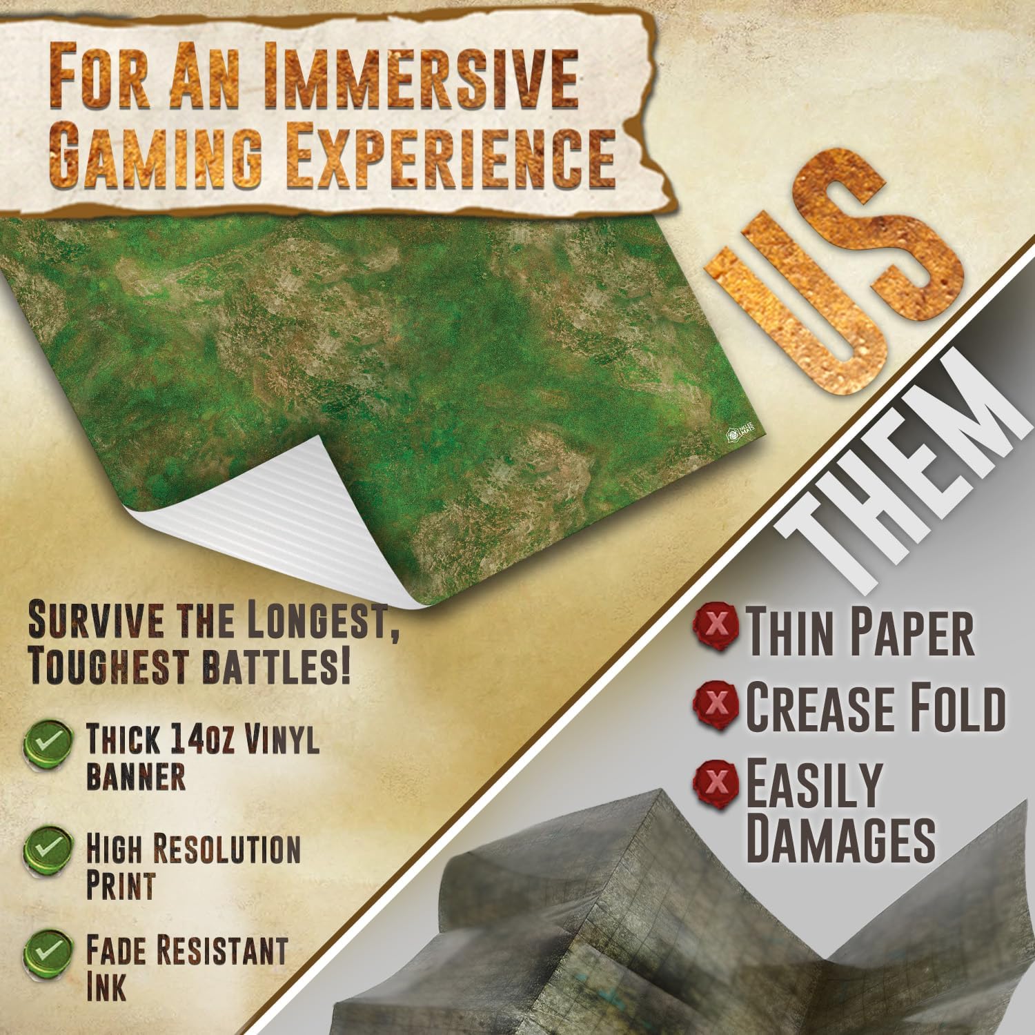 - ENRICH YOUR GAMING EXPERIENCE - A heavy-duty gaming mat, made to handle plenty of epic journeys and battles! Transform your tabletop or gaming surface quickly and easily with our battle gaming field mat. Each mat is carefully crafted with detailed terrain making it a valued addition to your next quest!