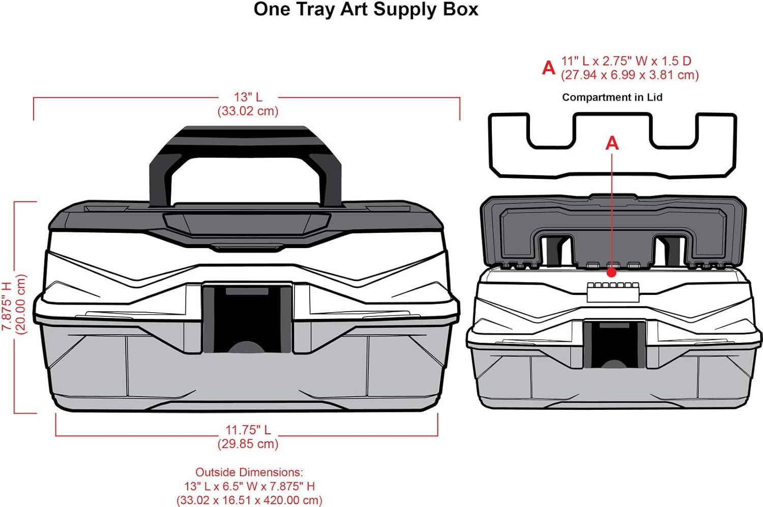 - Product Details: the 1 Tray Art Supply Box measures 7.9 x 13 x 6.5 in. It has a single top tray with removable dividers.