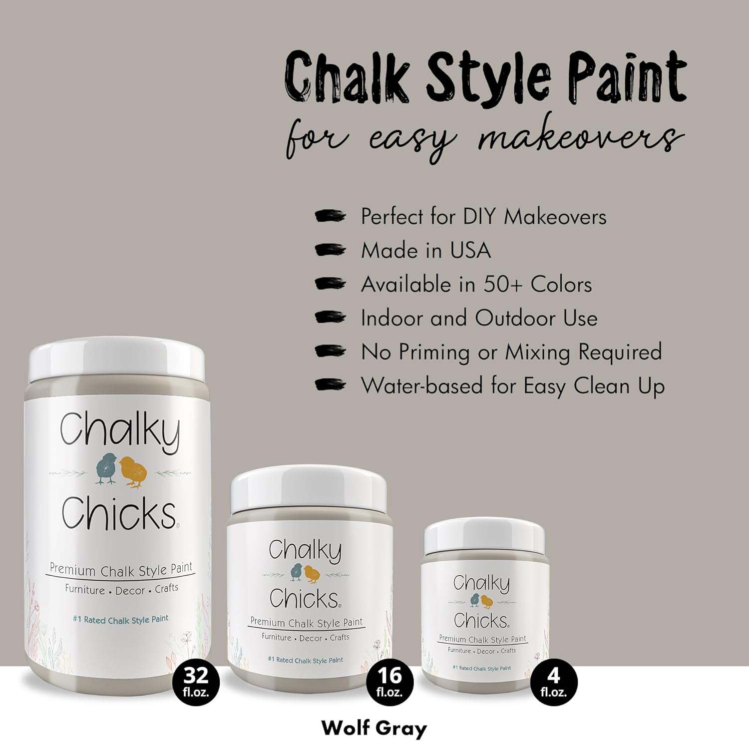 Chalky Chicks All-in-One Chalk Paint for Furniture or Cabinet - 32 Fl Oz - Matte Finish Wolf Gray (Gray/Beige) for Metal, Wood Furniture Paint - No Sanding All-in-One for Home Decor & Crafts, USA Made