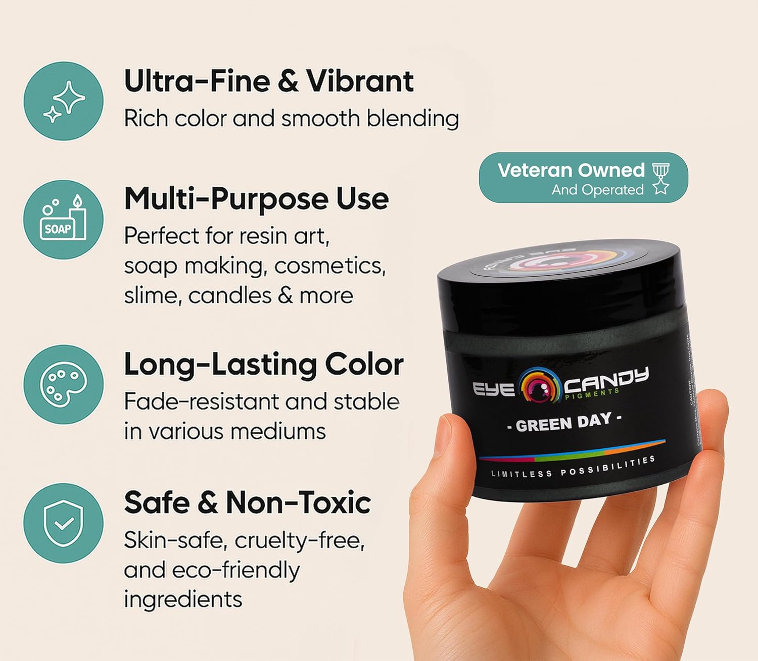- MULTIPURPOSE GREEN MICA POWDER β Introducing Green Day, a green pigment gracefully tinged with subtle grey notes. This unique shade radiates understated elegance and effortlessly adapts across various applications. Elevate your creative ventures, be it in epoxy resin or acrylic painting. Add a sophisticated twist to slime, bath bombs, and more. Ideal for jewelry, melt & pour techniques, plastics, and candles. Experience the myriad possibilities.