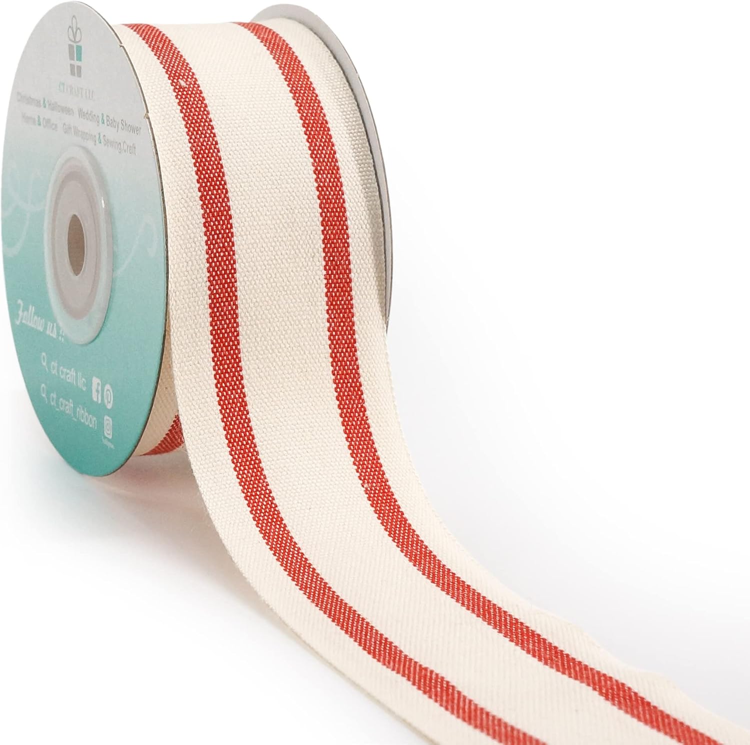 CT CRAFT LLC Ivory Cotton Red Stripes Ribbon 1.5" x 10 Yards for Home Décor Gift Present Wrapping DIY Crafts Birthday Wedding Bouquet Christmas