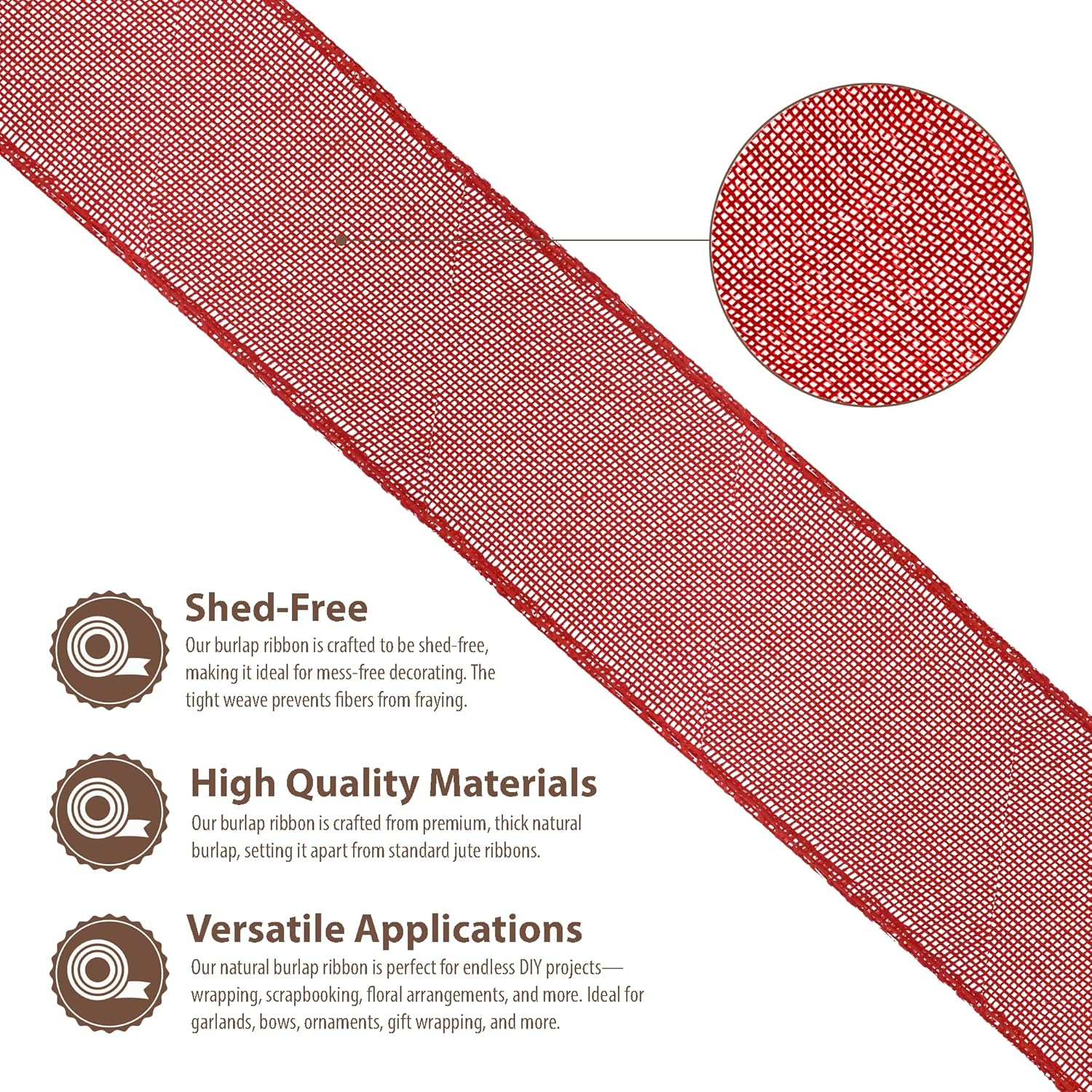 - Natural Burlap Ribbon: Compared to other jute burlap ribbons, our rustic burlaps ribbon with a fray & shed-resistant hemmed edges is made from thicker red burlap fabric. The indoor & outdoor colored burlap crafts ribbon is colorfast and will not bleed.