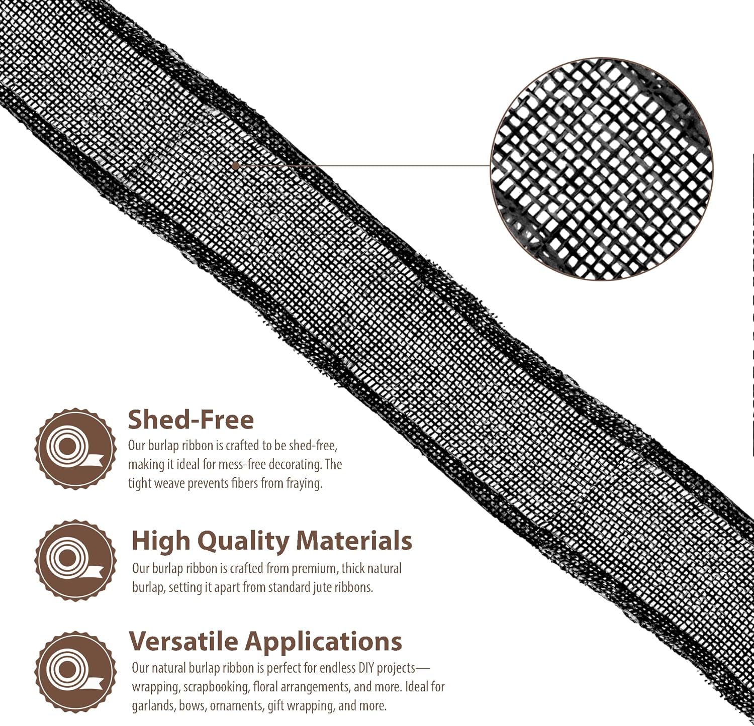 - Natural Burlap Ribbon: Compared to other jute burlap ribbons, our rustic burlaps ribbon with a fray & shed-resistant hemmed edges is made from thicker black burlap fabric. The indoor & outdoor colored burlap crafts ribbon is colorfast and will not bleed.