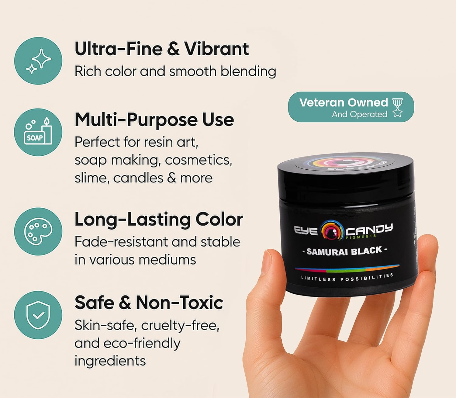 - MULTIPURPOSE BLACK MICA POWDER β Experience the depth of Samurai Black, a black pigment infused with subtle silver nuances. Elevate your crafts with this luxurious shade, from bold jewelry to captivating art. Ideal for epoxy resin, acrylic painting, and jewelry crafting. Also perfect for slime, bath bombs, melt & pour, plastics, and candle making. Dive into a world of creativity with Samurai Black.