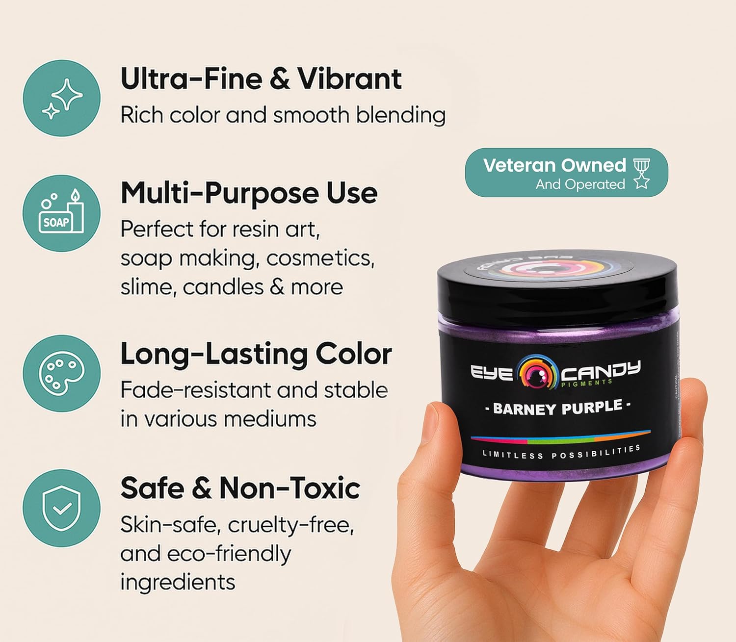 - MULTIPURPOSE PURPLE MICA POWDER β Dive into the mesmerizing depth of our Barney Purple, a pure and captivating purple pigment. This shade embodies the essence of regal beauty, ensuring every creation stands out with undeniable elegance. Whether you're crafting or creating, this pigment is your ticket to stunning results. Perfect for epoxy resin, melt & pour, plastics, acrylic painting, slime, bath bombs, jewelry, and candle making.