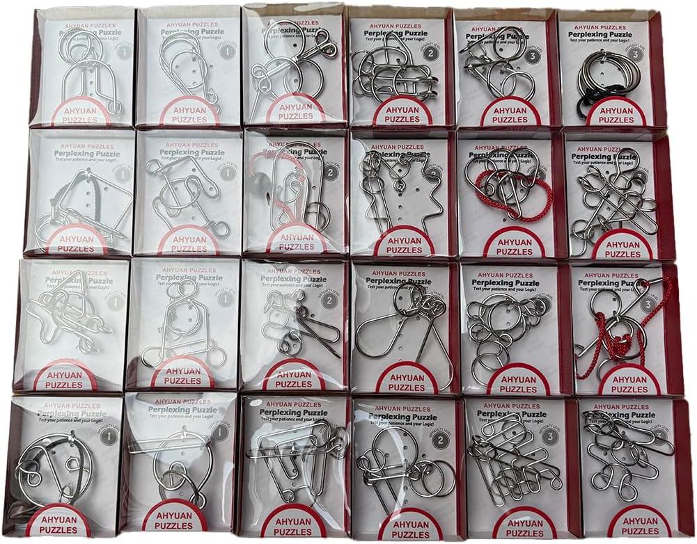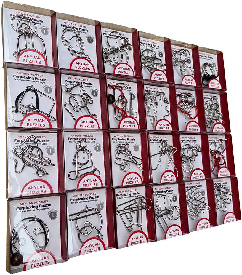 AHYUAN 24 Packs Large Metal Puzzles Brain Teaser IQ Wire Puzzles with Individual Backside Solution Paper Box Gift Package Educational Puzzle Games Toys Magic Trick Toy Party Favors for Kids Adults