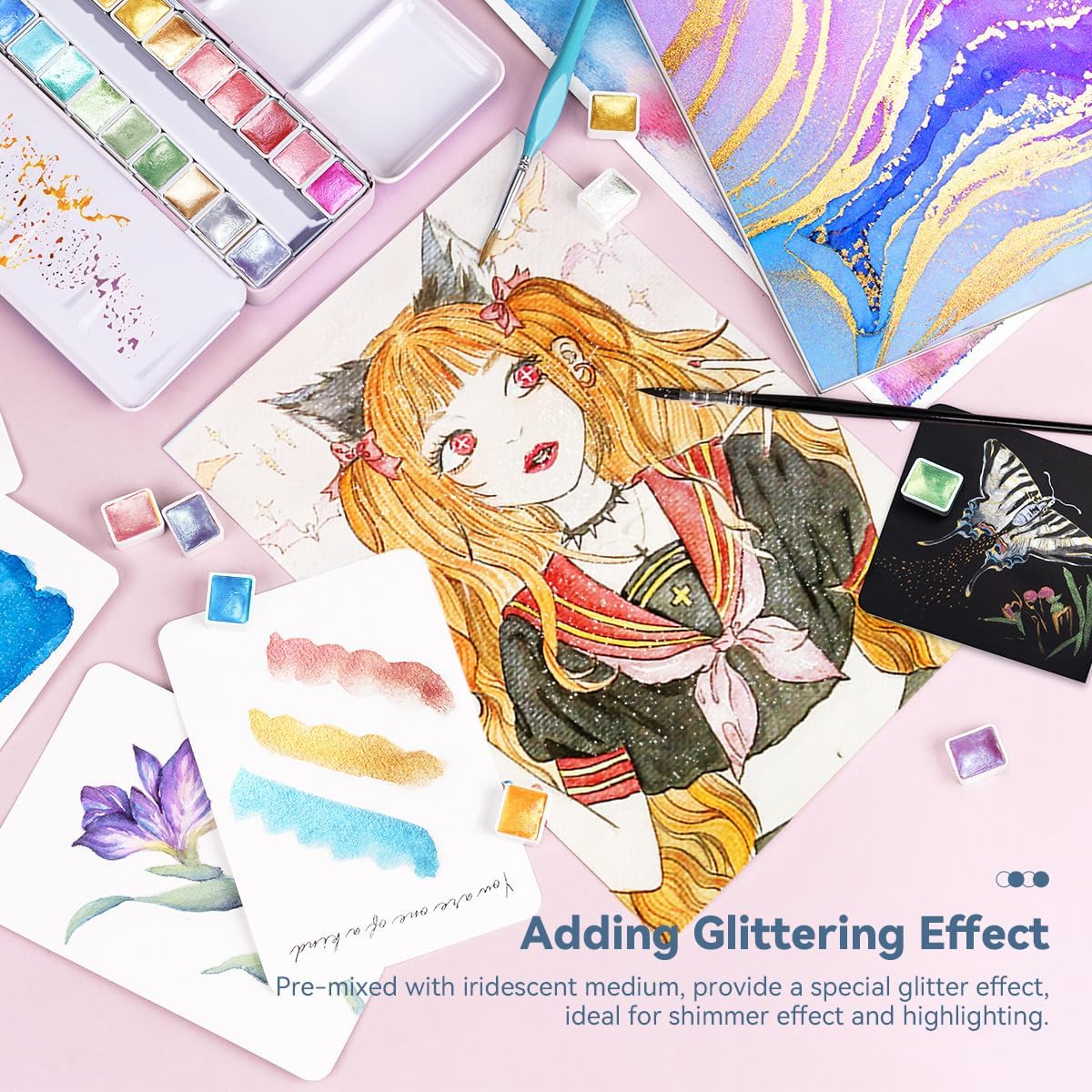 - 24 Metallic Glitter vivid colors: ultra-pure pigments that wonβt easily become muddy when mixed; high transparency; strong tinting; excellent lightfastness ratings. These top-quality paints will make your artwork stay vivid for a very long time