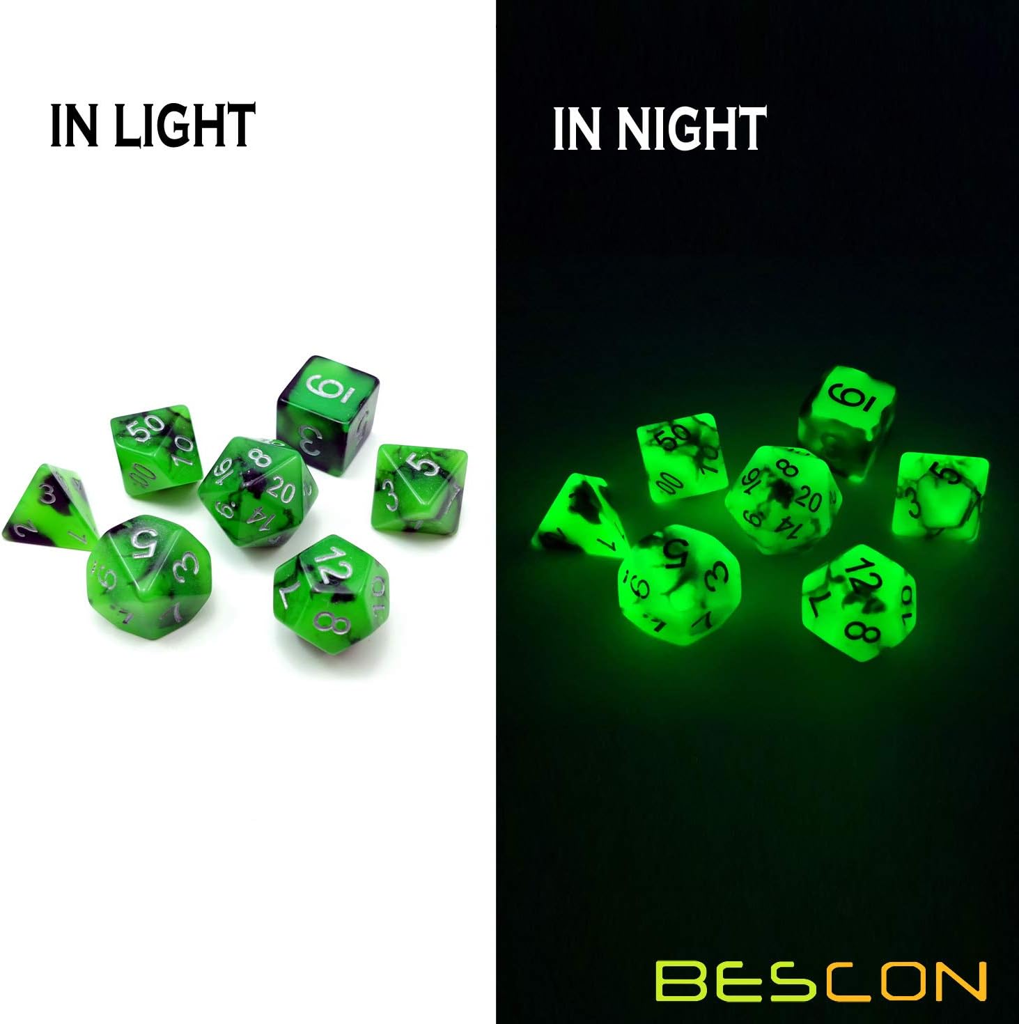 - Bescon Two-Tone Glow-in-the-Dark Polyhedral Dice Set SPOOKY ROCKS, Luminous RPG Dice Set d4 d6 d8 d10 d12 d20 d% Brick Box Pack