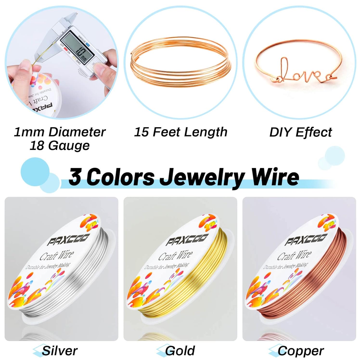 - PACKAGE INCLUDED: Paxcoo jewelry wire set includes 3 rolls of 18 Gauge tarnish resistant craft wire in different colors. They are easy to use and work with different types of beads, necklace, bracelet and other Jewelry DIY projects