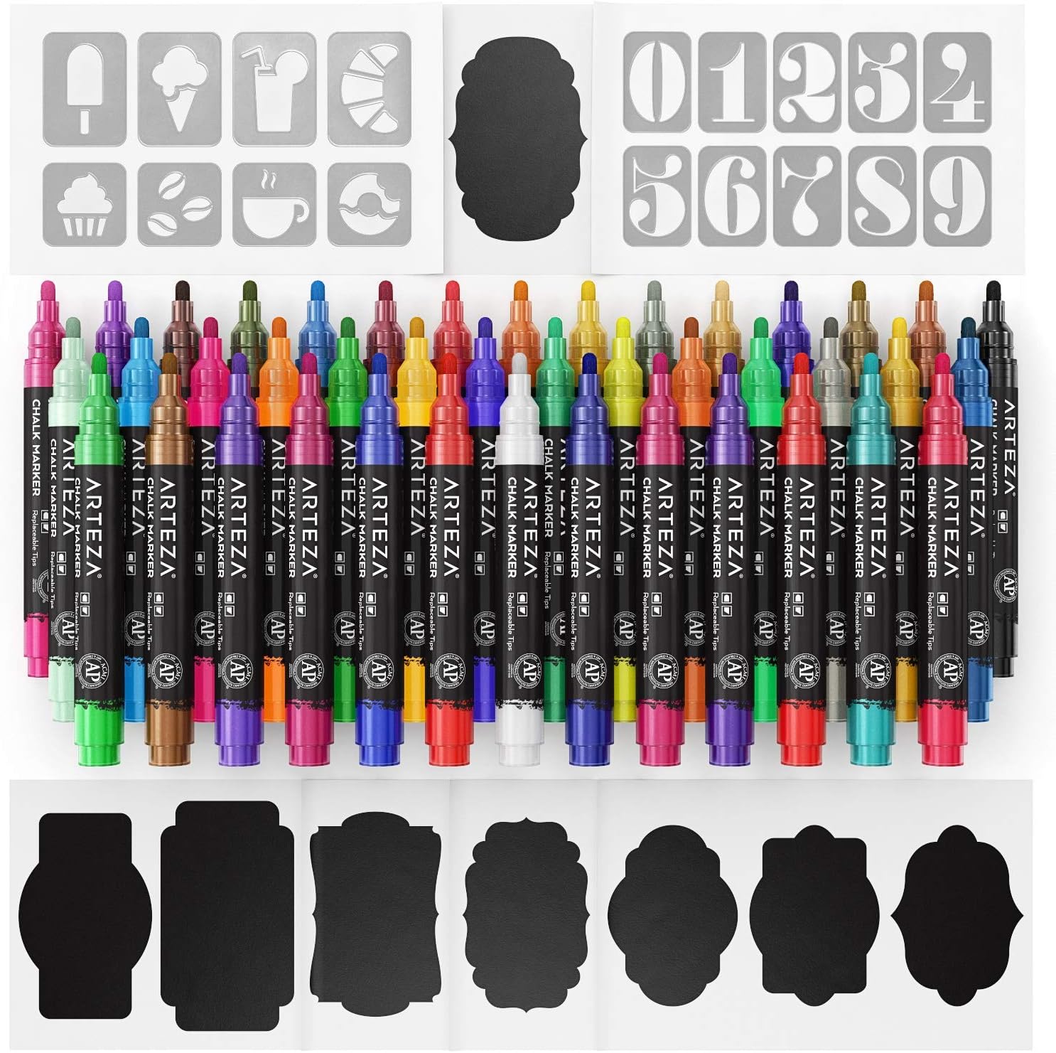 ARTEZA Liquid Chalk Markers, 42 Colors Pack with 50 Chalkboard Labels, Fine Tip Chalk Pens for Blackboard, Whiteboard, Windows, Mirrors, Glass