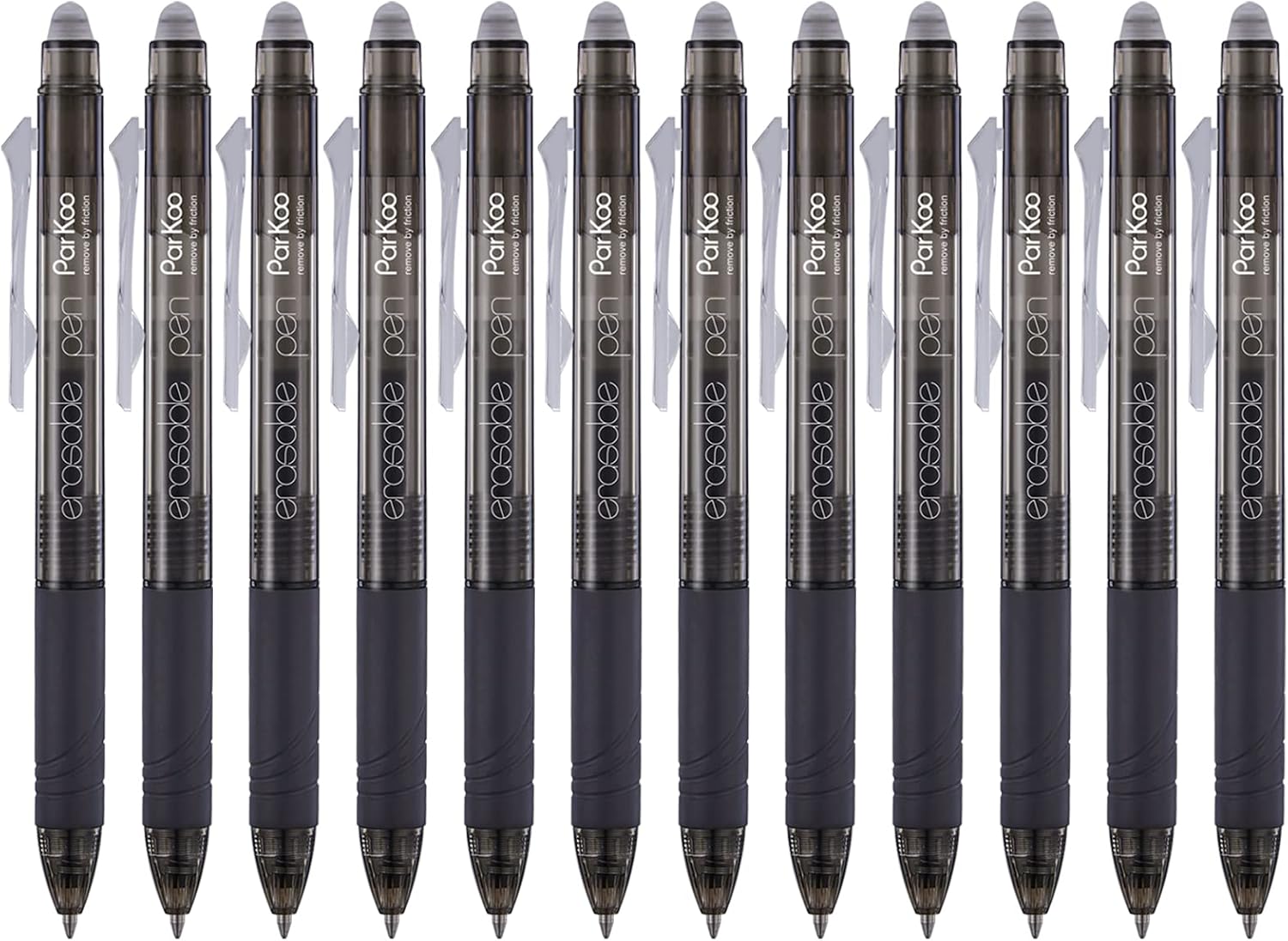 - 12 Black, Retractable Design: 12 black pens with 0.7 mm fine point tip; Smooth writing gel ink: nontoxic, acid-free, non-bleeding, heat erasable; Eraser is on the top of the pen; the pen is retractable by pressing the side clip down