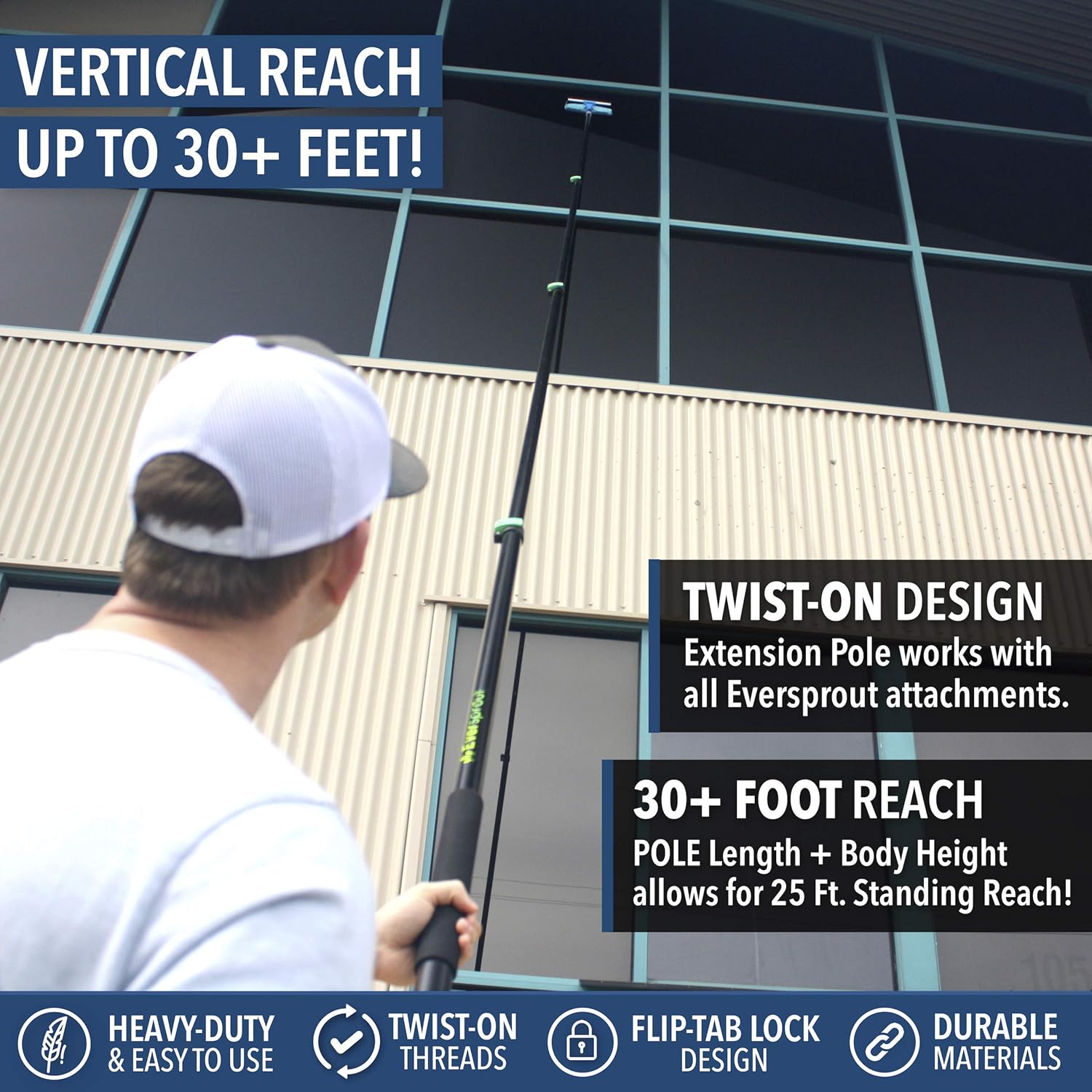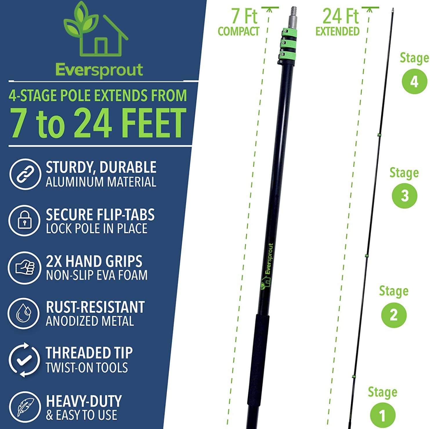 EVERSPROUT 7-to-24 Foot Telescopic Extension Pole (30 Foot Reach) | Heavy-Duty Sturdy Aluminum | Easy Flip-Tab Lock Mechanism | Twist-On Metal Tip Works for Squeegee, Duster, Paint Roller (Pole only)