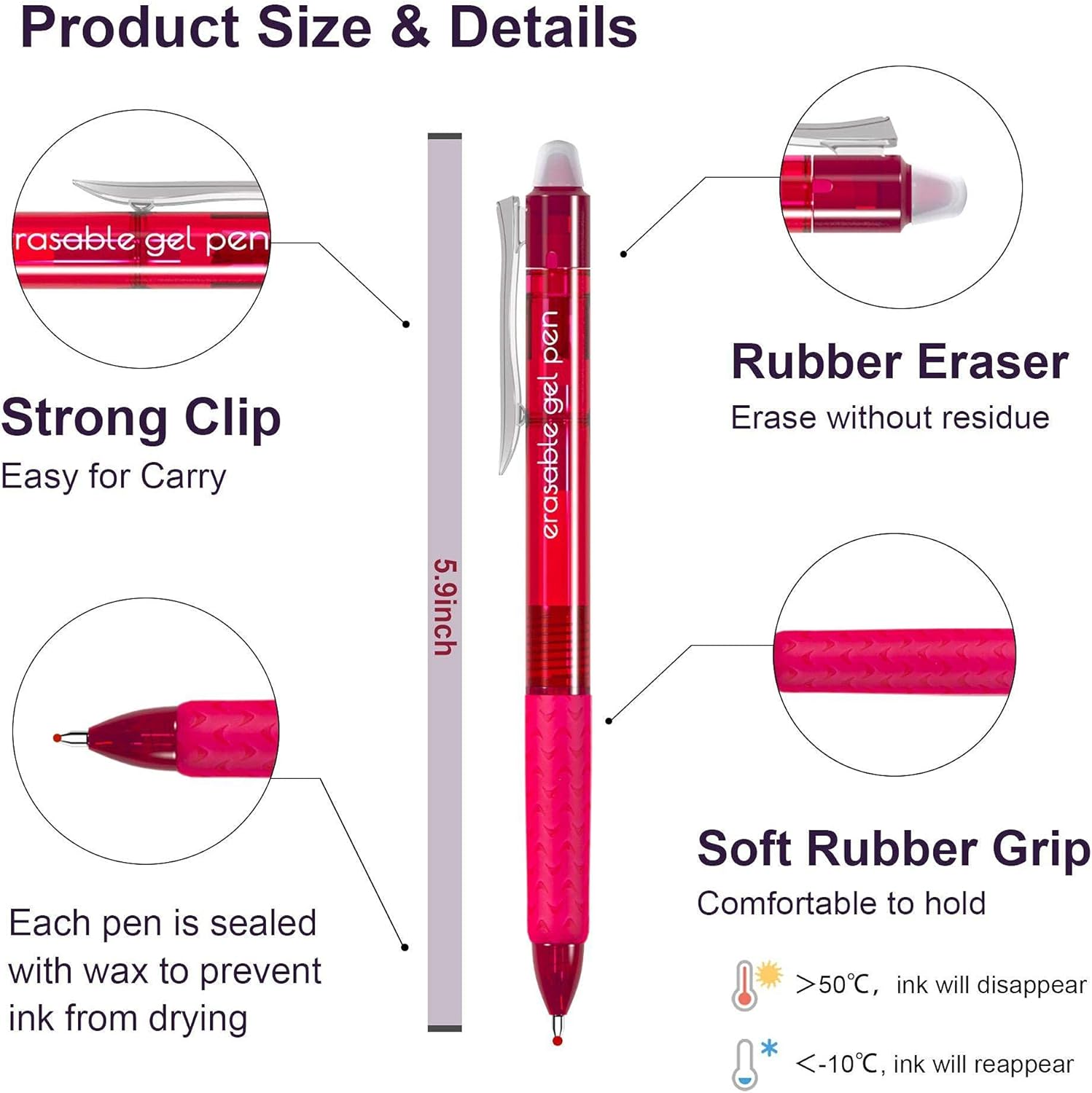 - 【Erasable and Retractable】: Each gel pen is fitted with eraser at the top end and retractable by pressing the side clip down .They write like gel pens and erase like pencils(Please erase after the ink has dried completely),you can use them smoothly without worrying about any mistakes ,just erase errors out with the rubber at the top of pen ,no residue and no damaging documents!