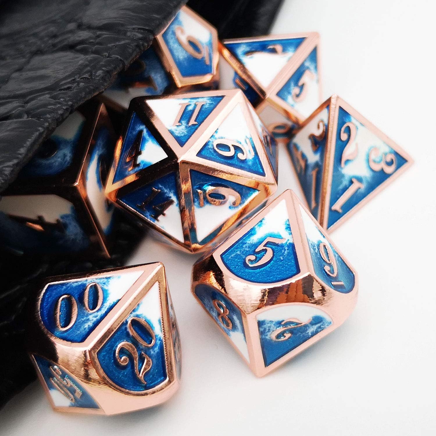 - Rosegold Blue White Metal DND Dice Set: 7pcs dice set containing: D20, D12, D10, D%, D8, D6, D4
