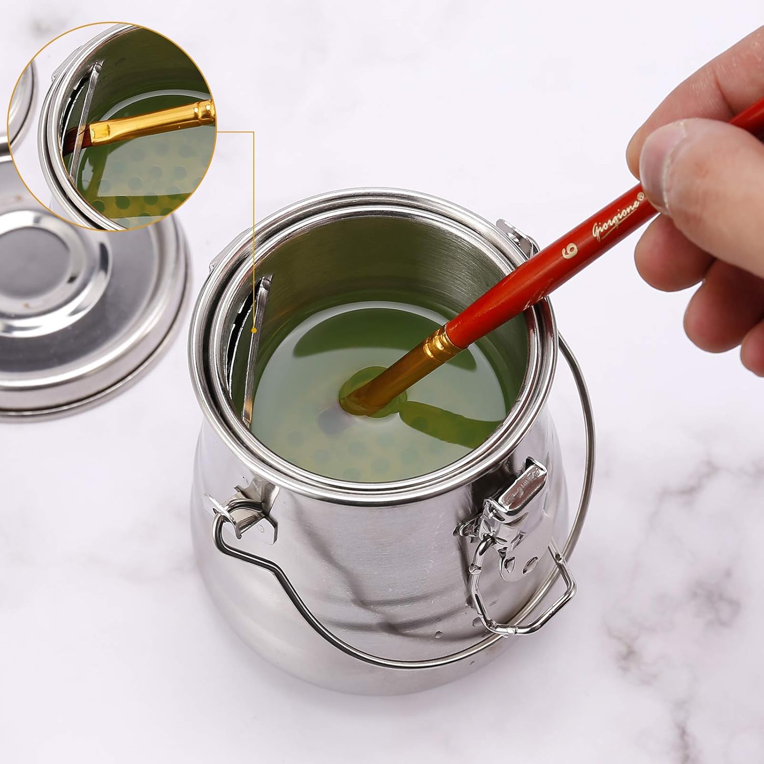 - STORING SOLVENTS AND MEDIUMS - Airtight brush washer features a sturdy metal construction and will help you store and transport turps and mineral spirits safely. With its sealable lid which has a rubber gasket inside and clips securely closed you can now take your water, mineral spirit with you already in the bucket.