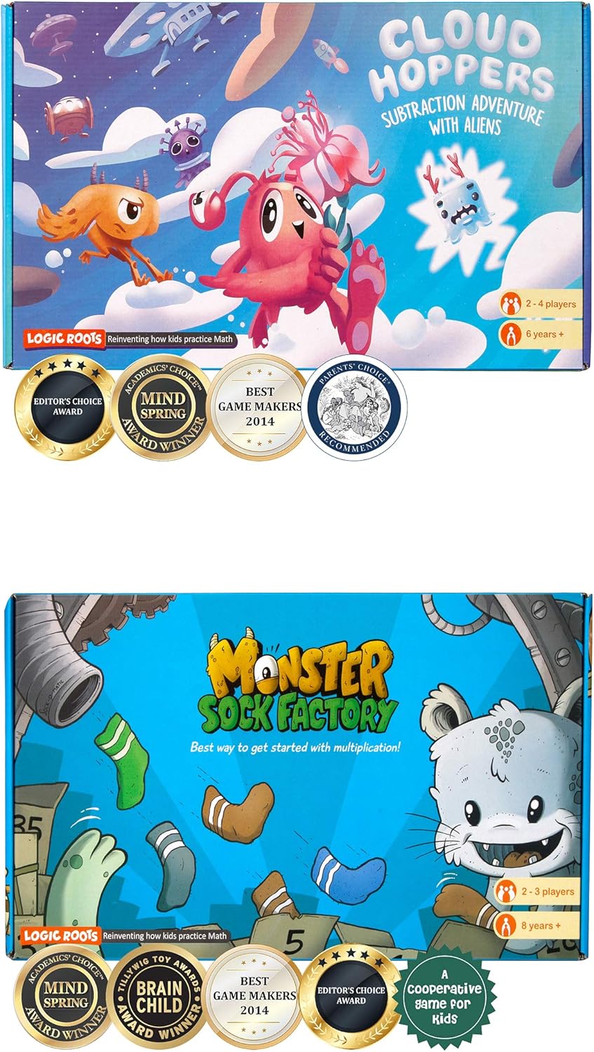 - 2 AWARD WINNING STEM GAMES: Cloud Hoppers is additional and subtraction game. Monster Sock Factory is a game to master multiplication facts. 3 critical math skills in one box