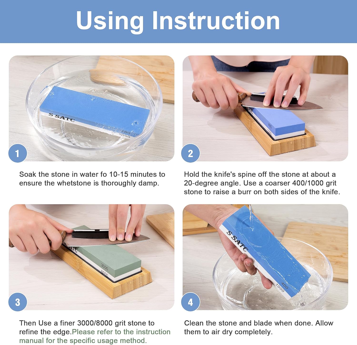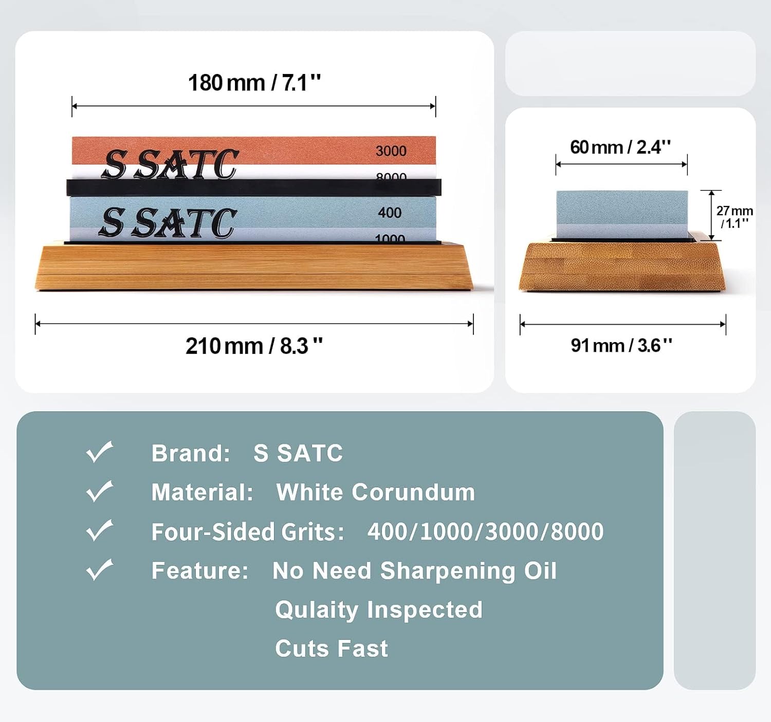 S SATC Knife Sharpening Stone Whetstone 4 Side Grit 400/1000 3000/8000 Stone Knife Sharpeners with Nonslip Rubber Bases, Wood Base, Flattening Stone, and Leather Strop