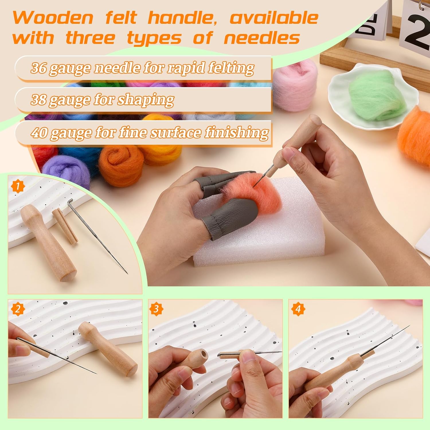 - Easy to Use - Felt kit contains 9 pcs felting needles and 2 pcs wooden felting handle, can easily help you complete the wool stamping project. There are three sizes of felting needles, (36/38/40gauge), each with 3 pieces. Thick needles are suitable for rapid felting stage, middle needles are suitable for shape shaping stage, and fine needles are suitable for surface fine processing stage.