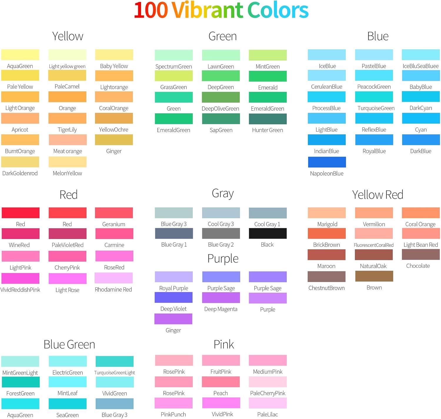 - 100 CLASSIC VIVID COLORS OPTIONS: This complete set of Duo Tip Pen art markers comes with a whopping 100 unique and vibrant color options to choose from, NO duplicate. Meet all you need for adult coloring books, drawing, coloring, sketching, doodling and just about anything else.