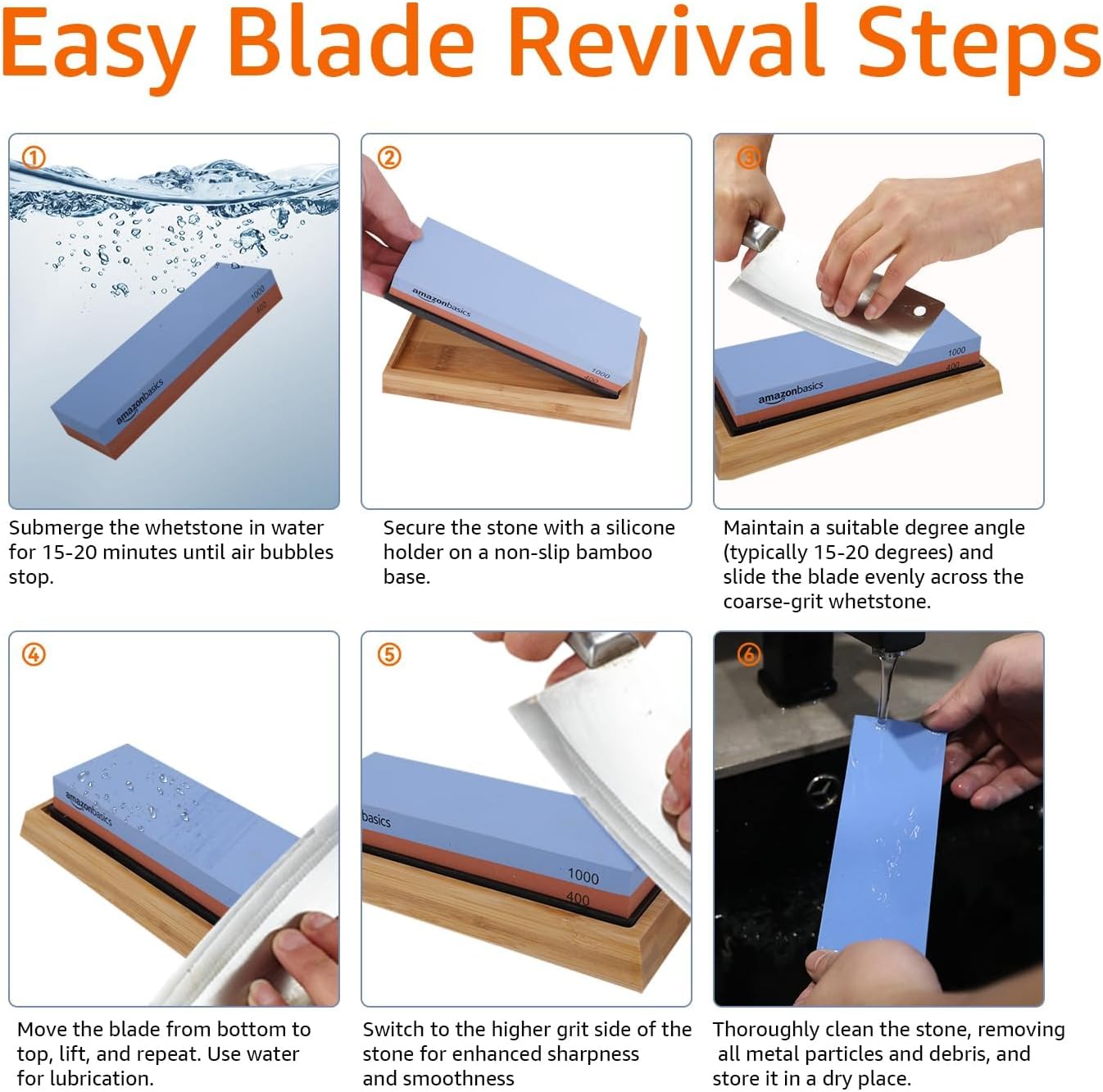 Amazon Basics Whetstone Knife Sharpening Wet Stone Dual Sided 400/1000 Grit with Non-Slip 1 Pc, Bamboo Base, Black & Grey