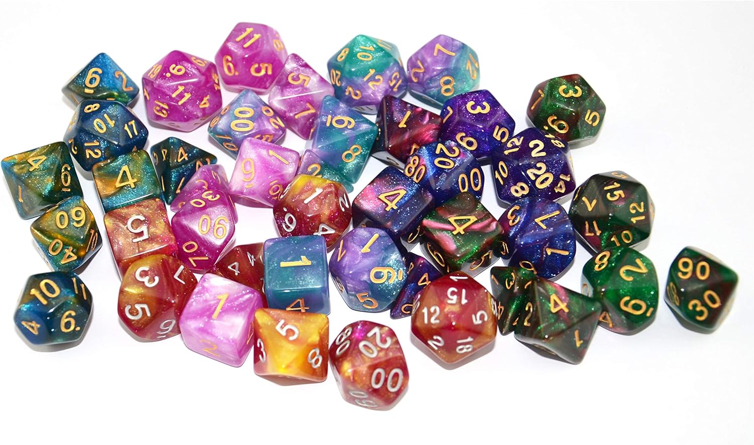 - You will receive 6 x 7-Die dice sets with 7 small pouches and 1 big pouch. A single 7-die set contains one d20, one d12, two d10 (00-90 and 0-9), one d8, one d6, and one d4.