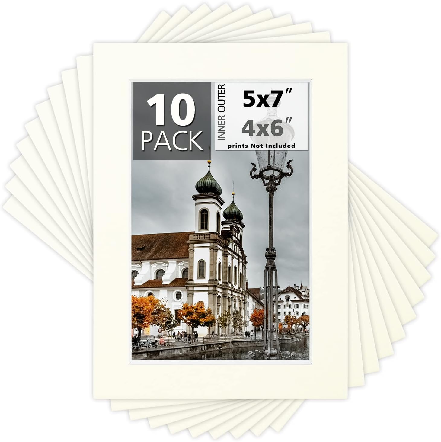 Mat Board Center, Pack of 10, 5x7 for 4x6 Ivory Turret Color Mats - Bevel Cut, Acid Free, 4-ply Thickness, White Core - for Pictures, Photos, Framing