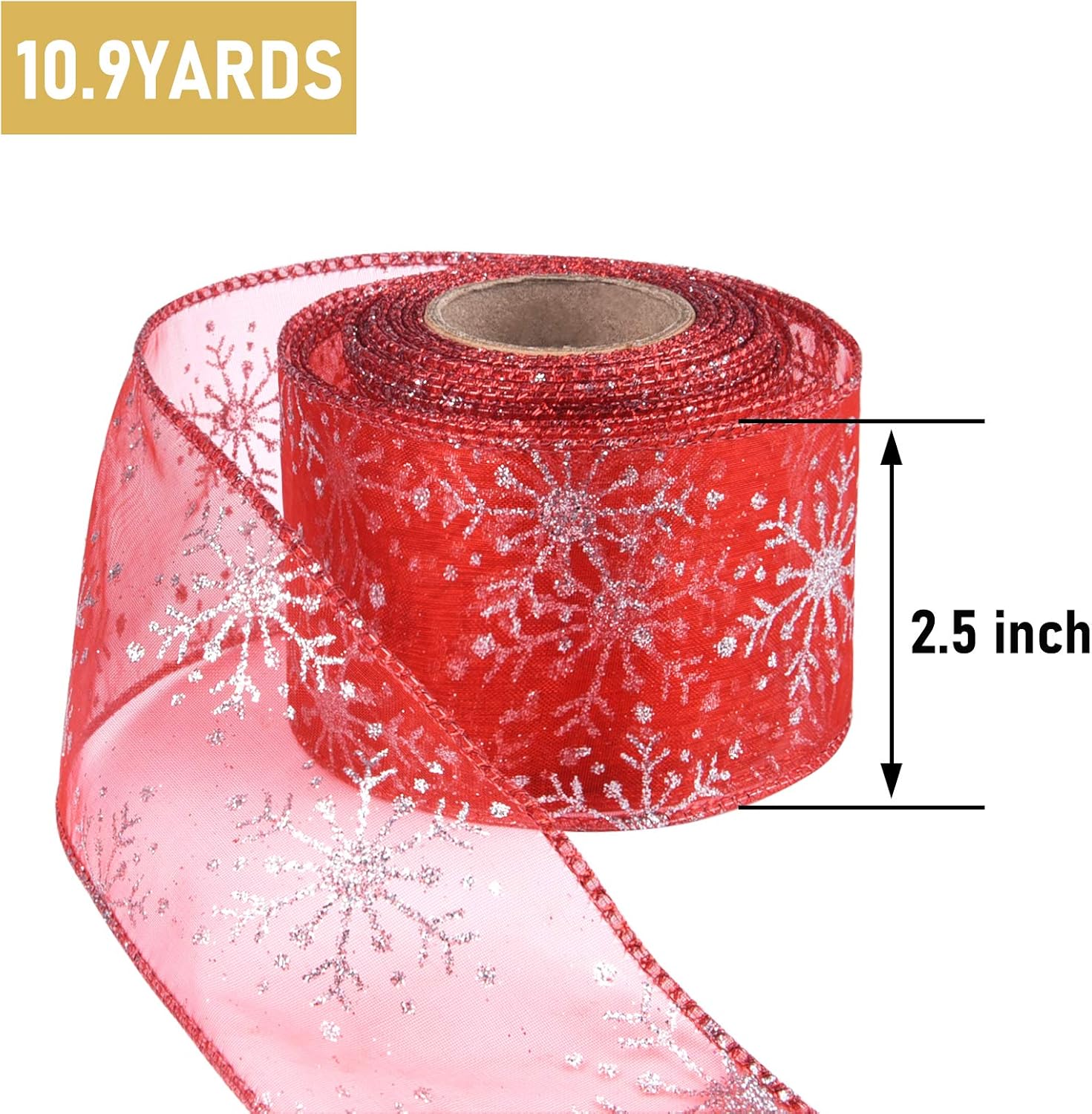 2.5 Inch Wide Christmas Wired Ribbon Snowflake Organza Sheer Glitter Ribbon for Xmas Tree, Wreath, Party Decoration, Gift Wrapping (Red, 10.9 Yards)