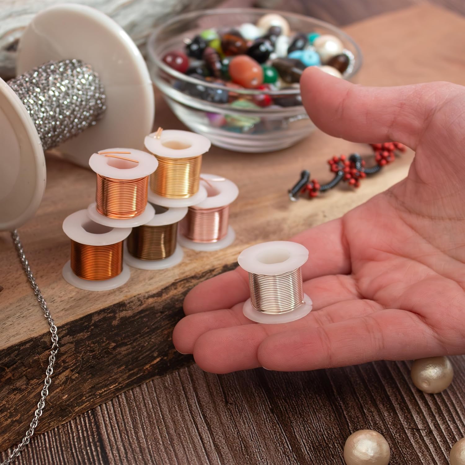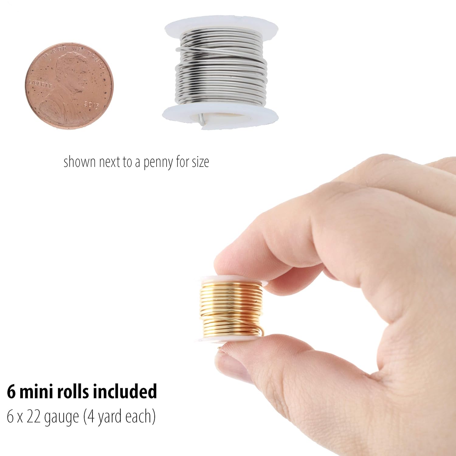 - INCLUDES: This assortment pack of medium temper wire contains six 0.75" (2 cm) mini spools, each containing 4-yards (3.6 m) length of craft wire. It includes 1 gold color, 1 silver color, 1 copper color, 1 rose gold color, 1 vintage bronze color, and 1 antique copper color. Each bobbin of wire is 22 gauge.