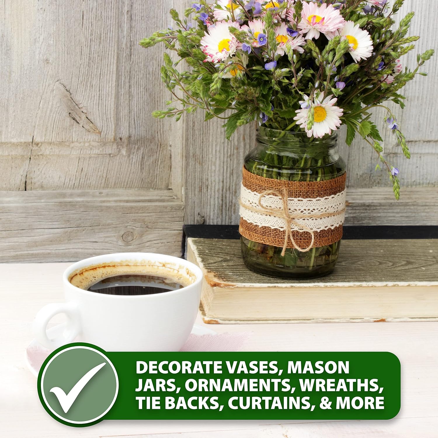 - Bulk Lace and Burlap Ribbon: Each continuous Β½ inch burlap ribbon with lace is 10 yard long. With two burlap rolls, total 20 yards long, the burlap ribbon bulk pack is handy to decorate trees and mason jars or hang pictures.