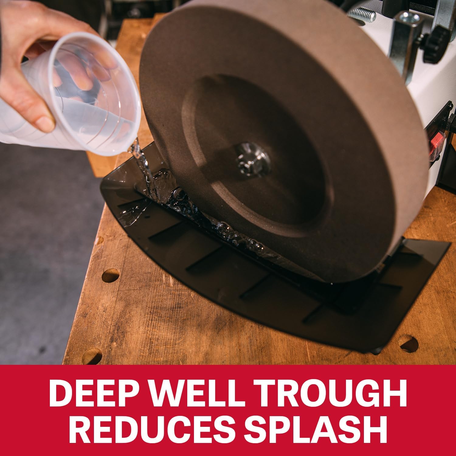 - Water-cooled stone grinding wheel prevents tools from overheating