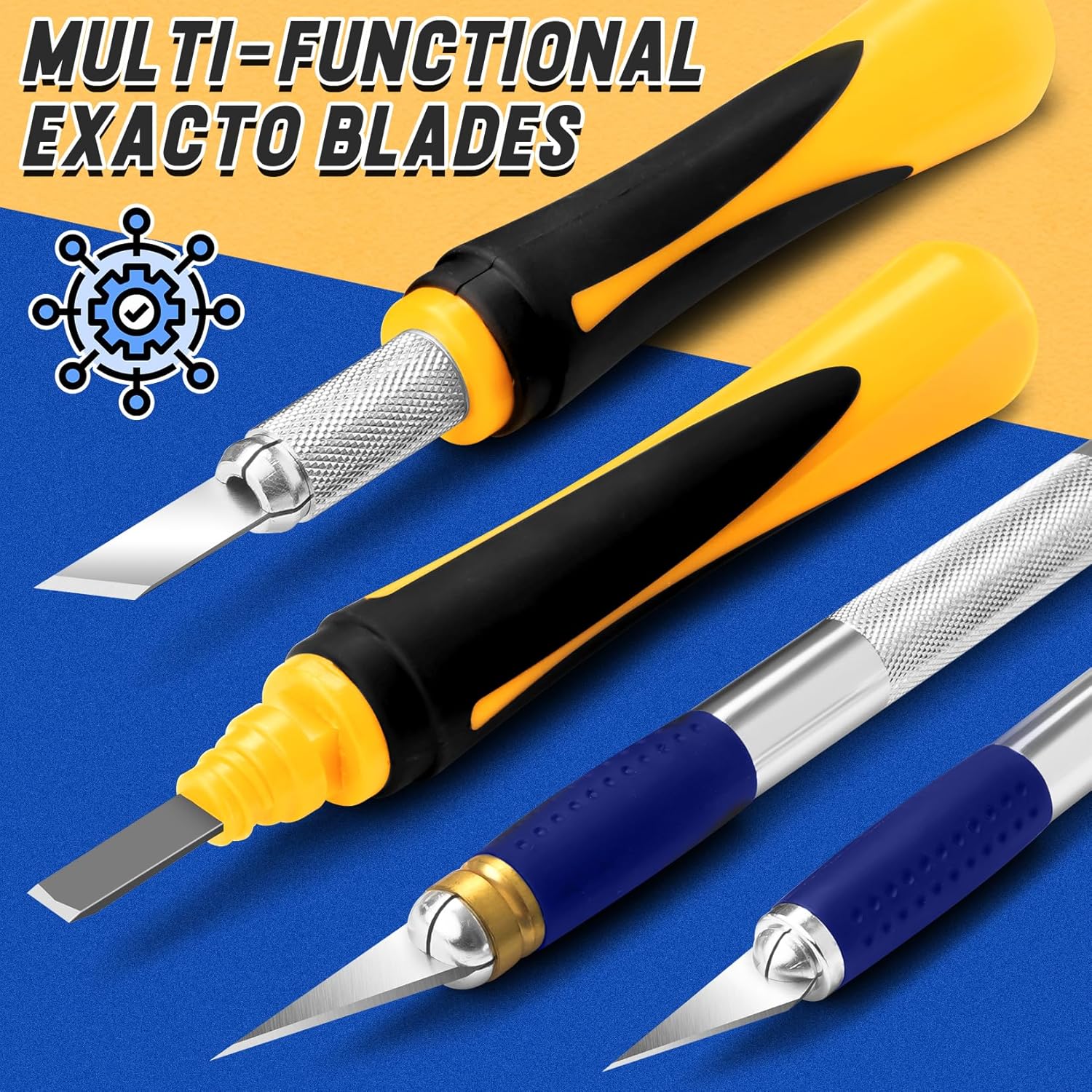 - VALUABLE ASSORTMENT: Unbox a treasure trove with this exacto knife set, featuring 4 versatile hobby knives and a collection of 13 interchangeable exacto blades in various shapes. All these tools are safely stored in a protective plastic case.
