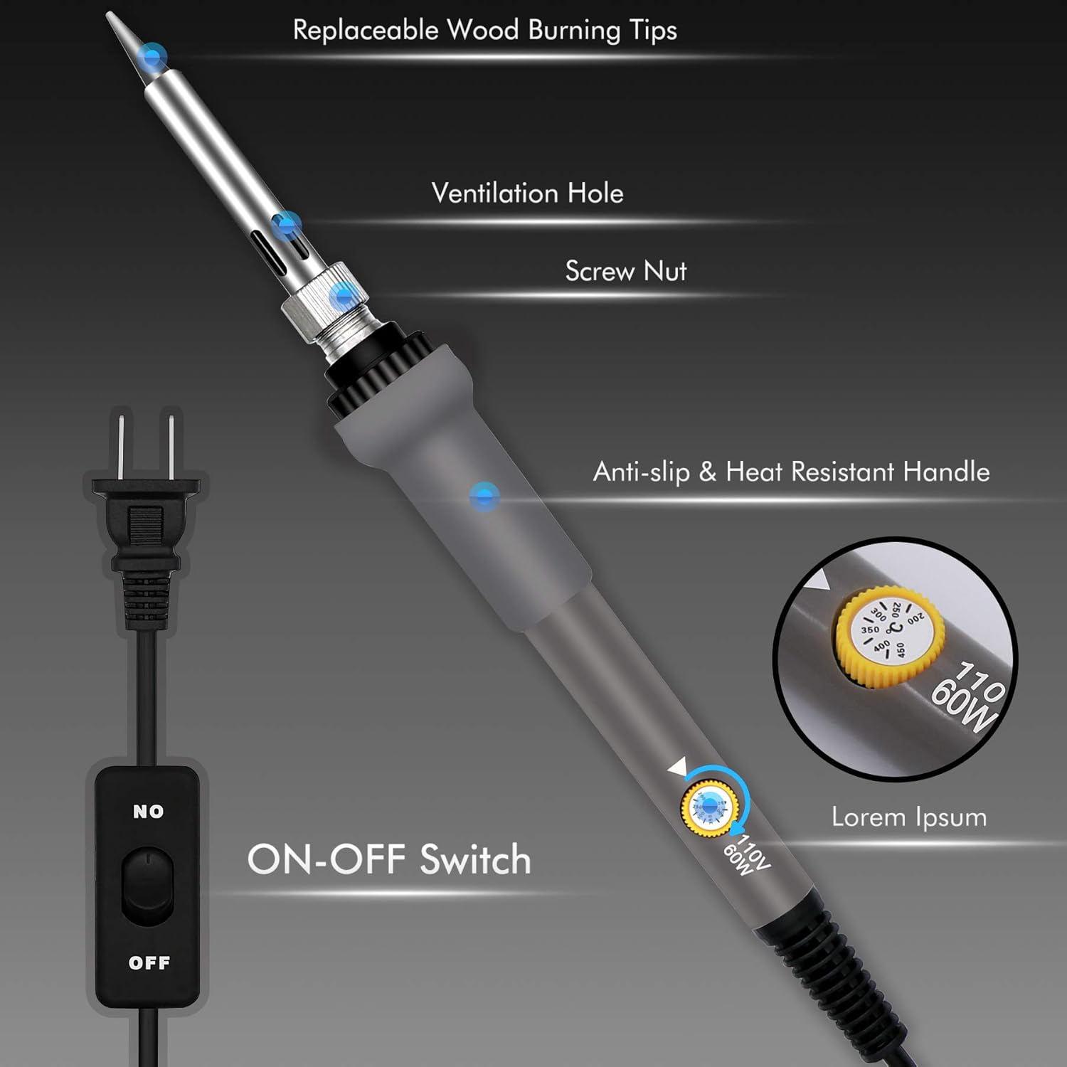 - ADJUSTABLE TEMPERATURE: The burning pen with ON/OFF switch, adjustable temperature from 200Β°C to 450Β°C. Heating ceramic technology can quickly heat the wood burning kit to meet your more creative needs. Do not apply too much pressure during use
