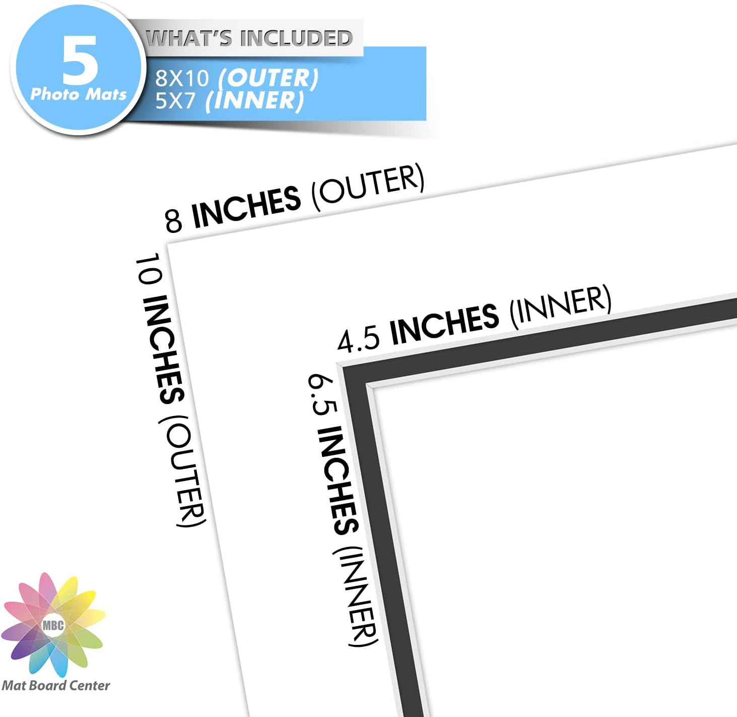 Mat Board Center, Double Mat - Acid Free, 8-ply Thickness, White Core - for Pictures, Photos, Framing (White Over Black, 8x10 for 5x7, Pack of 5)