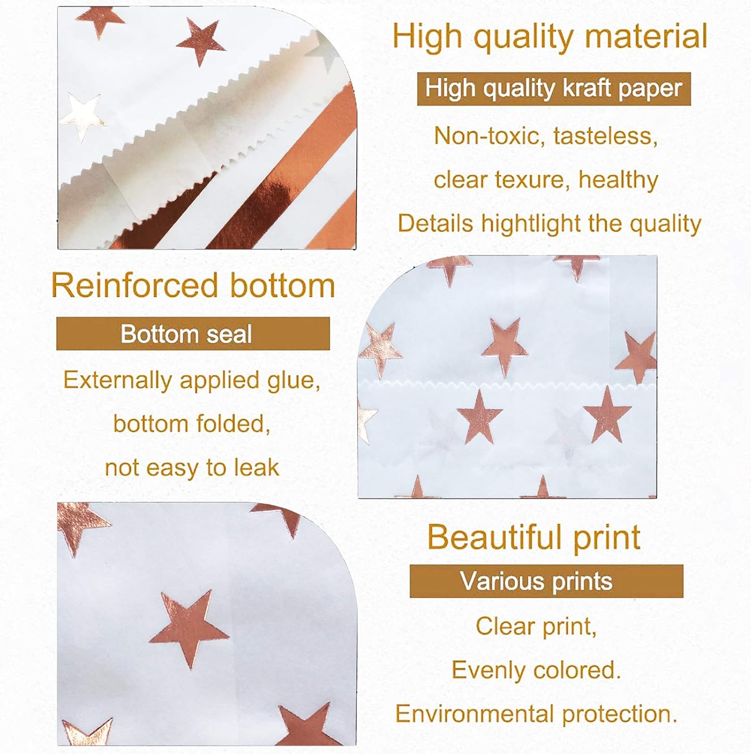- Package: 100 pcs candy paper bags with two or four different patterns (in the first picture). A pack of lightweight and strongly made small paper treat bags