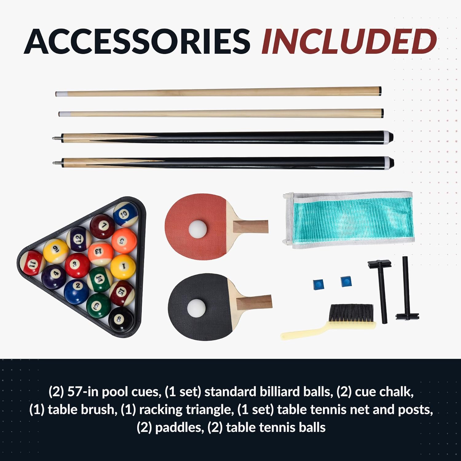 - COMPLETE GAME KIT AND WARRANTY β Includes pool cues, billiard balls, chalk, triangle, brush, net, paddles, and ping pong ballsβeverything you need for both games. Backed by a 180-day limited warranty for peace of mind.