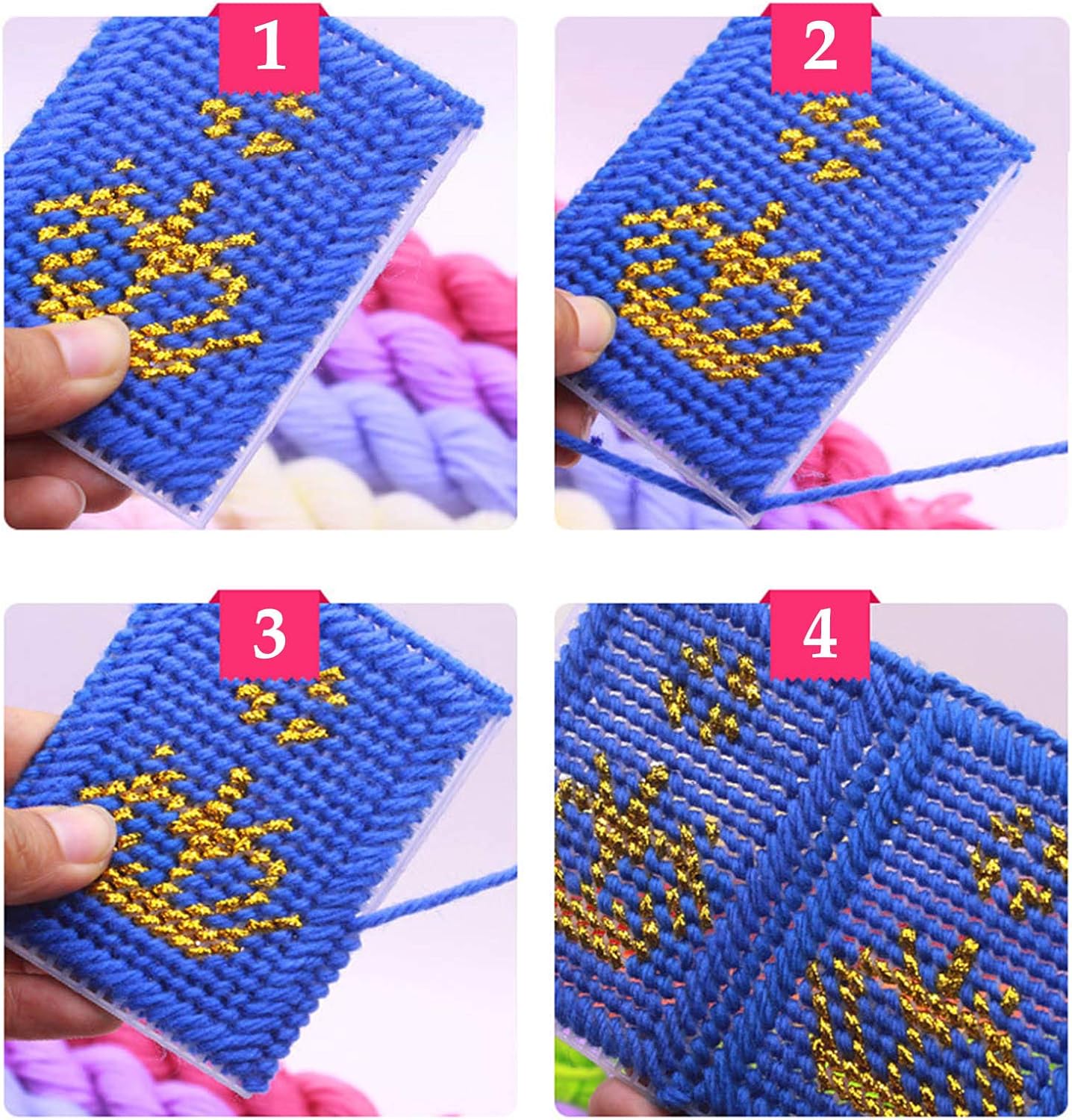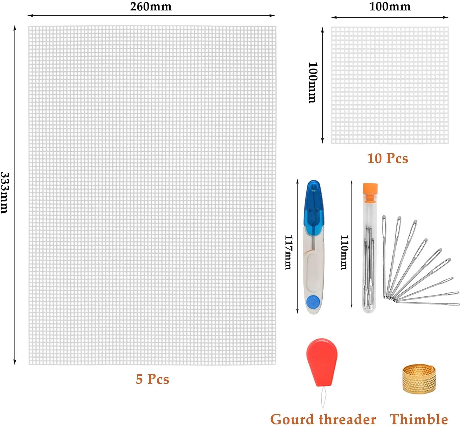 - Full Range of Plastic Canvas Kit - Packaging includes 10 Pieces 4 x 4 inch square plastic canvas, 5 pieces 13 x 10 inch plastic canvas, 12 color acrylic yarns, 1 pieces scissor, 1 pieces sewing thimble, 1 ieces needle threaders and 9 pieces metal needles.
