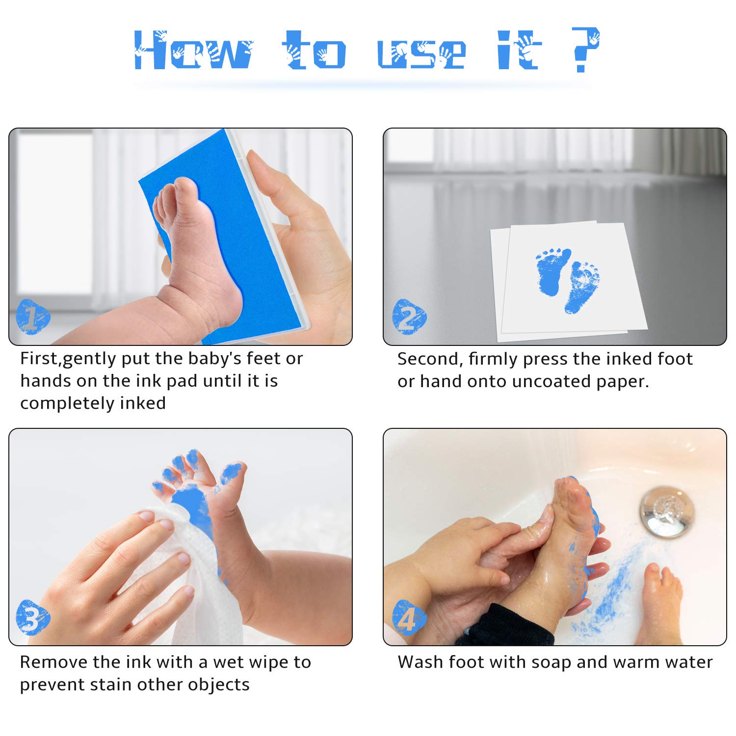 - [Baby Safe Ink Pad]: Eco-friendly sponge, non-toxic and acid-free ink protects baby's sensitive skin. Also, water-soluble features make it very easy to clean.