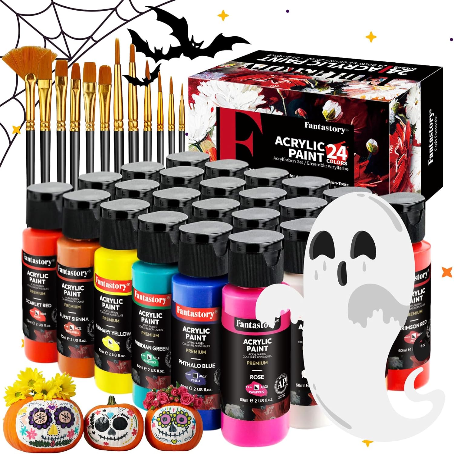 Fantastory Acrylic Paint Set 24 Classic Colors(2oz /60ml) with 12 Brushes, Professional Craft Thick Paints Kits for Adults, Canvas Wood Fabric Ceramic Rock Painting Supplies [Professional Series]