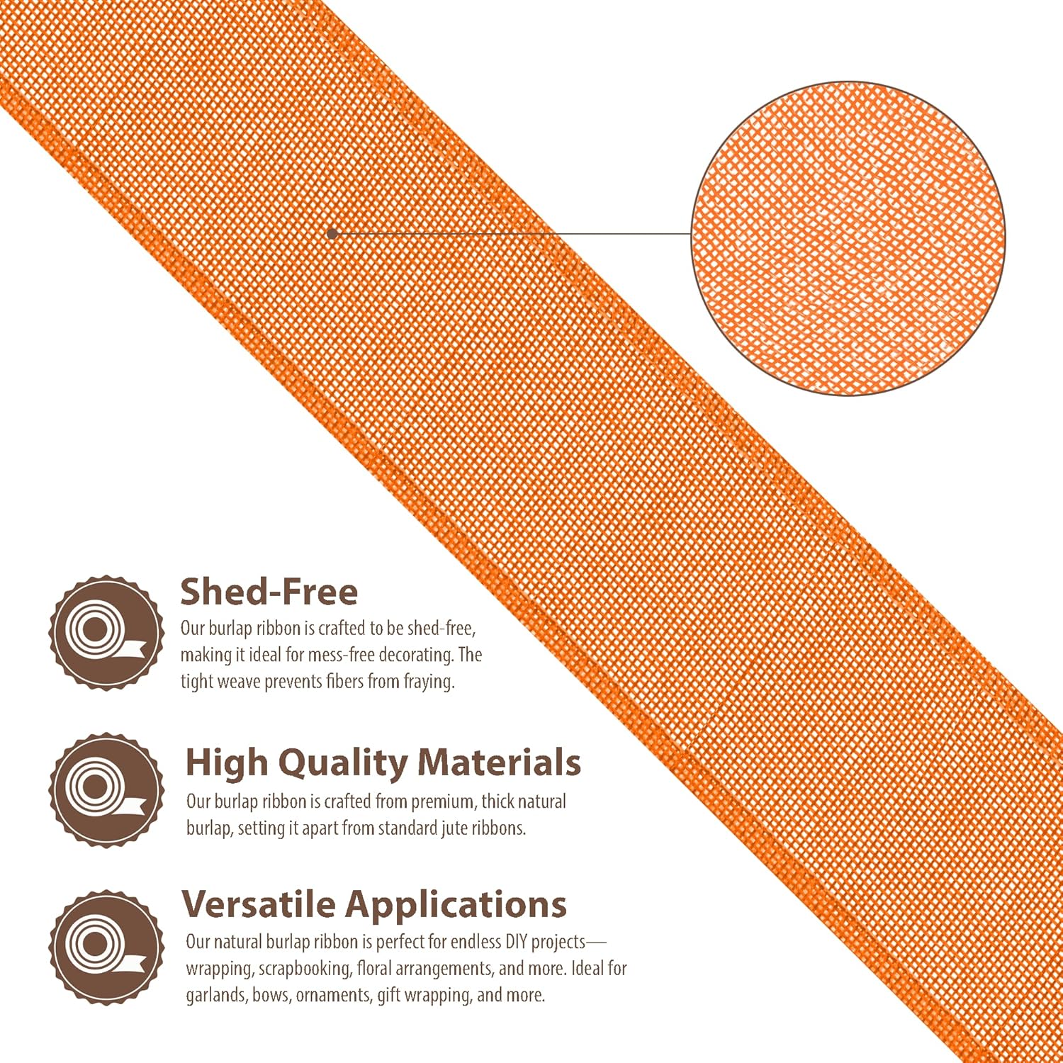 - Wired Burlap Ribbon: Compared to other jute burlap ribbons, our rustic burlaps ribbon with a fray & shed-resistant hemmed edges is made from thicker orange burlap fabric. The indoor & outdoor colored burlap crafts ribbon is colorfast and will not bleed.