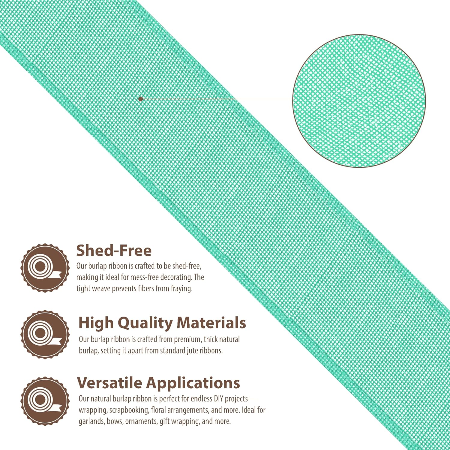 - Wired Burlap Ribbon: Compared to other jute burlap ribbons, our rustic burlaps ribbon with a fray & shed-resistant hemmed edges is made from thicker turquoise burlap fabric. The indoor & outdoor colored burlap crafts ribbon is colorfast and will not bleed.