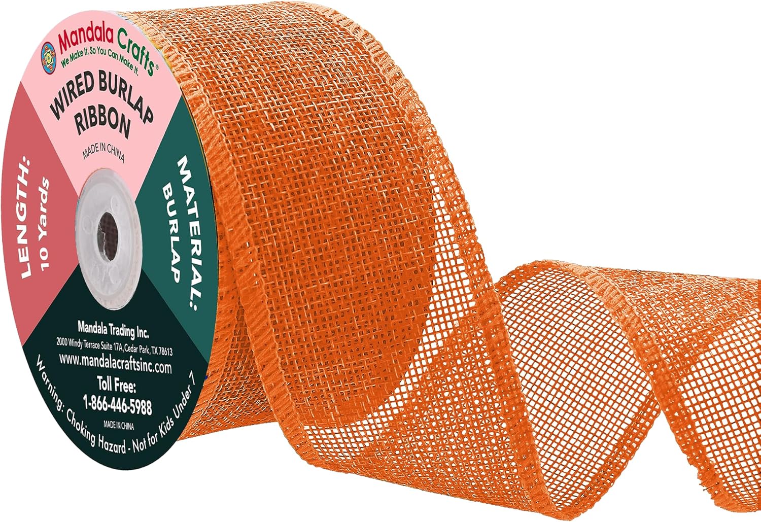 Mandala Crafts Orange Burlap Wired Ribbon 2 Inches Wide Jute Ribbons for Crafts - 10 Yds Roll Rustic Burlap Wrap Trim Ribbons for Wreaths Bows Party Decoration