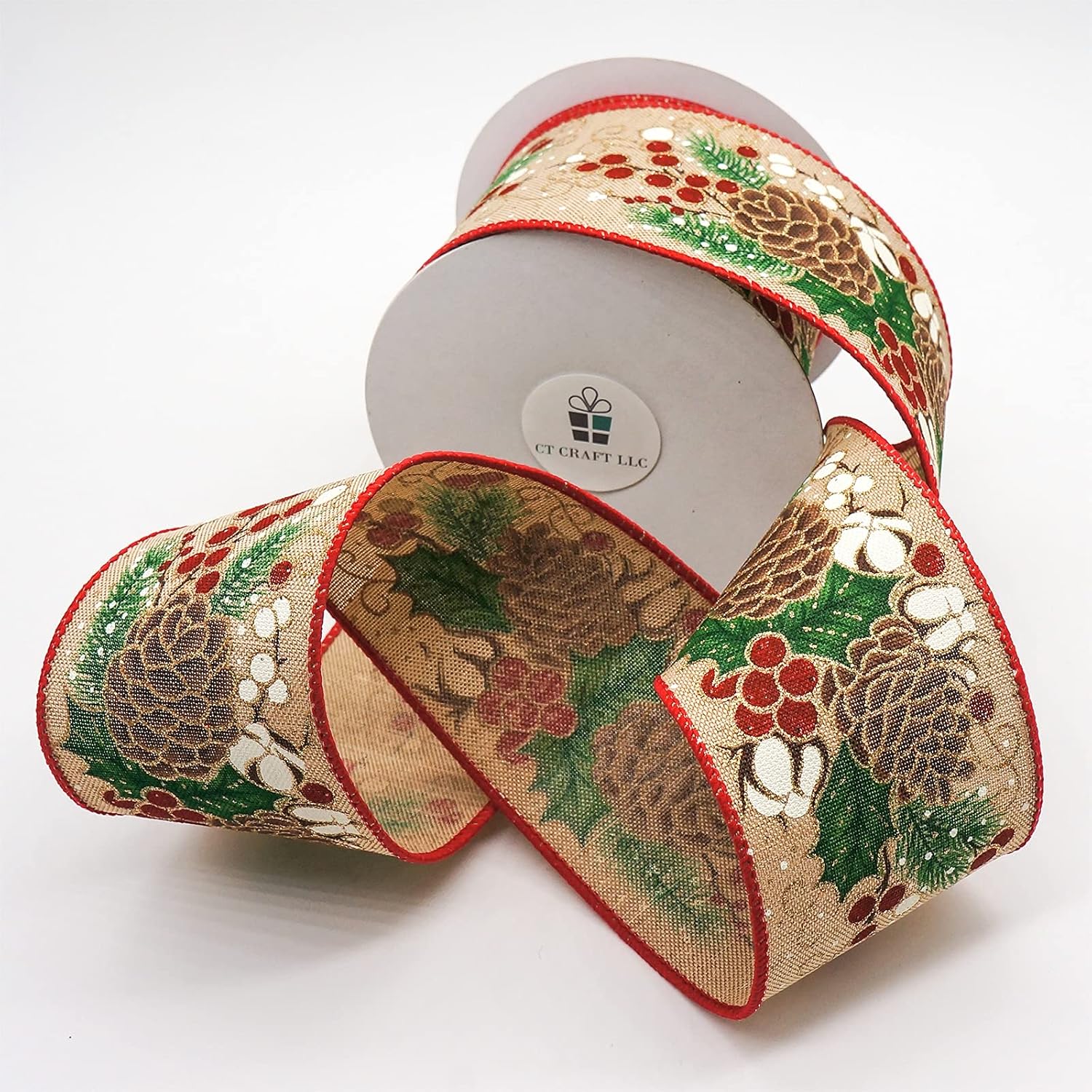 CT CRAFT LLC Tan Faux Jute Burlap with Pinecones Wired Ribbon 2.5 Inch x 10 Yards for Christmas Home Decor Tree Topper Bow Gift Wrapping DIY Crafts Wreath Garland