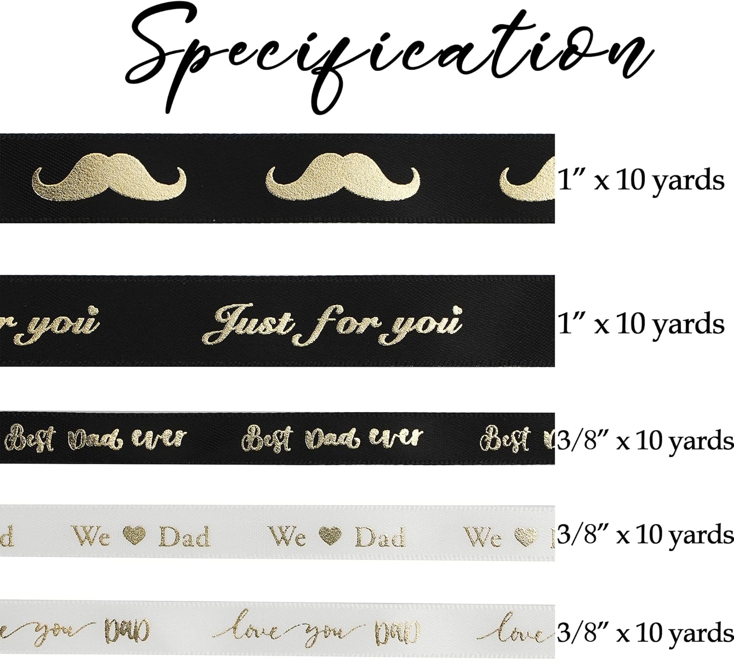 - Lovingly messages with Father's day in mind: 5 different Father's Day greetings and 2 classic black and white colors: 3/8" black satin with "best dad ever" print, 3/8" white satin with "we love dad" in gold font, 3/8" white satin with "love you dad" print, 1" black satin with mustache in gold foil and "Just for you" in gold font printed on 1 inch black satin ribbon.