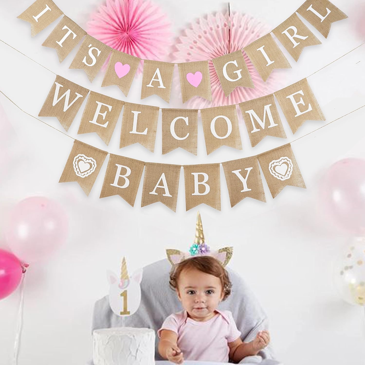 MEEDEE Burlap Banner Welcome Baby Girls Banner Rustic Baby Shower Party Favors Decorations Banners and Signs Baby Shower Bunting Pink (3 Pieces)