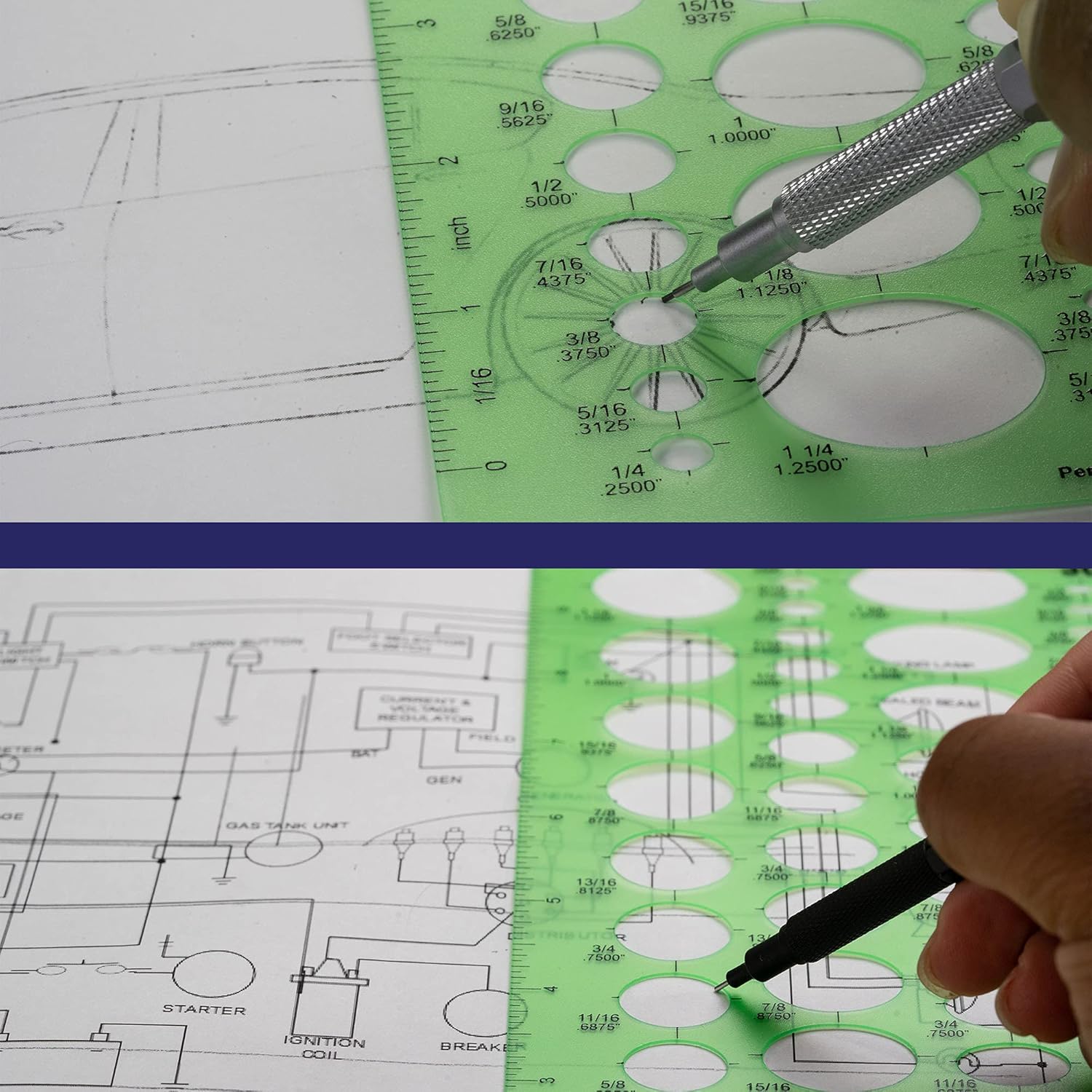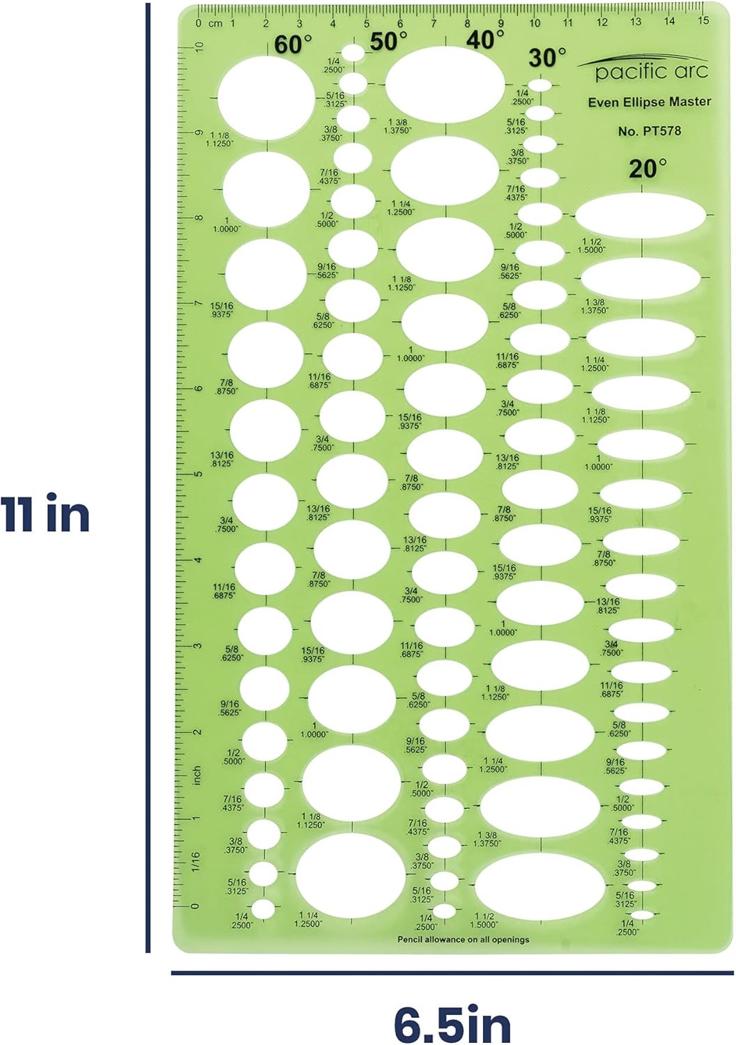 - COMPREHENSIVE TEMPLATE - This template contains 79 ellipses with five degree projections in 20, 30, 40, 50, 60. Ellipse sizes range from 1/4 inch to 1 and 1/2 inch. It also features 10 inch and 15 centimeter rulers. Ideal for students, drafters, and architects.
