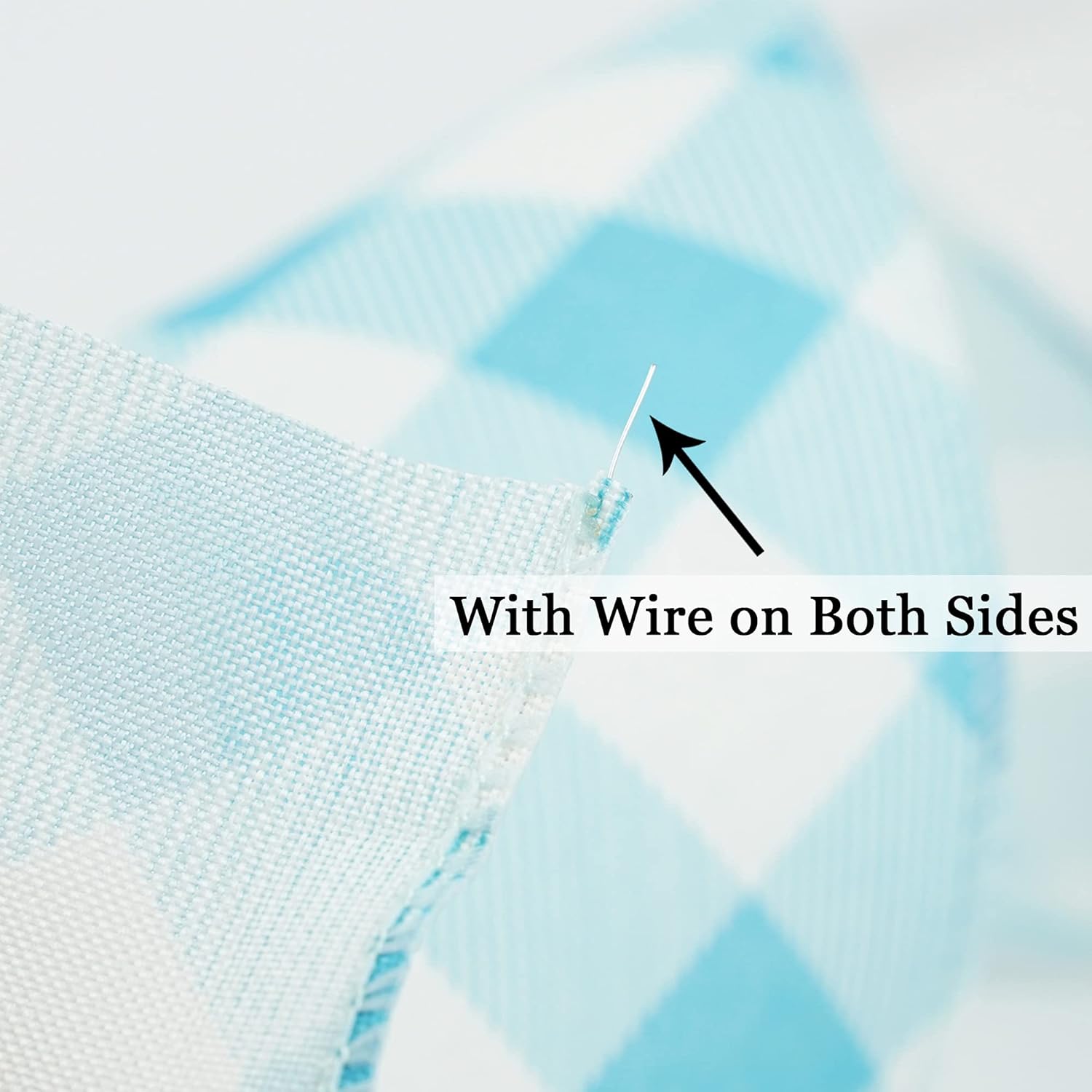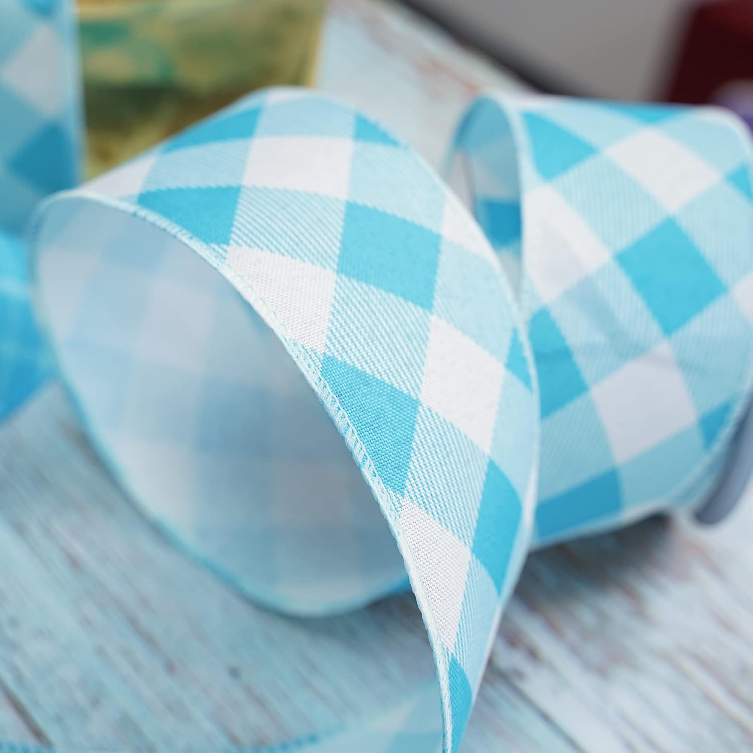 - Classic Pattern: This wired ribbon is designed with baby blue and white gingham pattern for wreaths or bows 2.5" x 10 yards by the roll. The ribbon has an blue threaded wired edge. Ribbon is shipped on the spool and would be beautiful for all of your craft needs, great product for wreath makers!