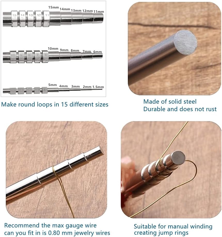 - Easy to use, economical and practical jewelry tool, make round loops in 15 different sizes, create uniform and consistent loops in your wire work in shapes. Each mandrels has 5 steps, 15 sizes in total. Suitable for 1.5mm/2mm/3mm/4mm/5mm/6mm/7mm/8mm/9mm/10mm/11mm/12mm/13mm/14mm/15mm loop forming.